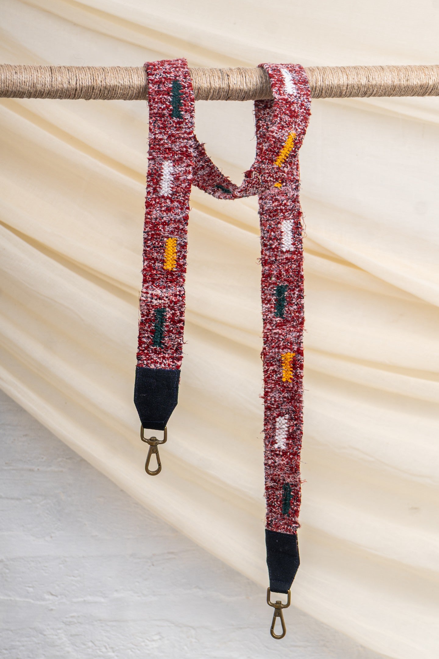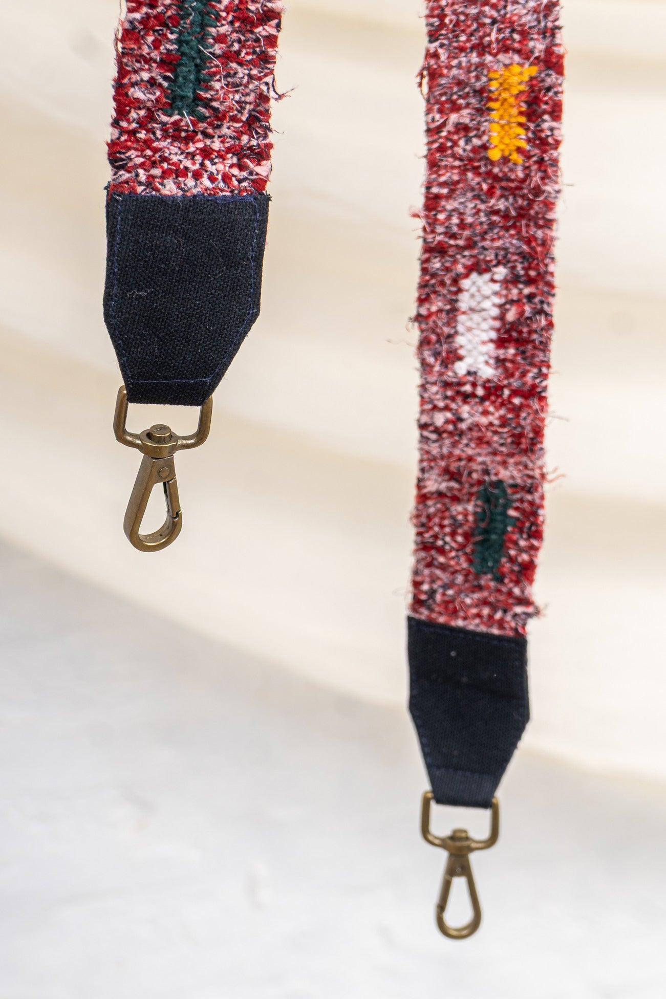 Rich red tones created from upcycled fabric strips, woven into a dense, durable strap. The colours resemble the warmth of earth and clay — grounding yet vibrant.
