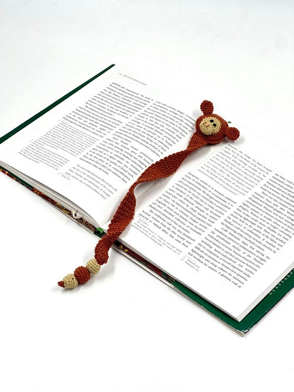 Meet your playful new reading buddy! Our Cheeky Chimp crochet bookmark is handcrafted in warm brown tones, featuring a fun little monkey face with wooden beads at the ends, making it as delightful as it is functional. Whether you're flipping through a novel or marking a planner, this bookmark will bring a smile to your face every time.