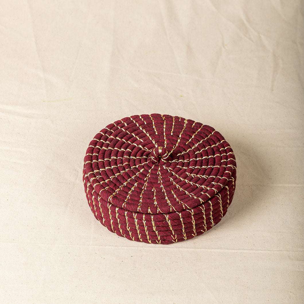 A basket with a lid that can be used for everything from storing knick-knacks to serving chapatis and breads. Handcrafted by our basket team and bound together with a glimmering golden thread, this basket is sure to add loads of style to your table!