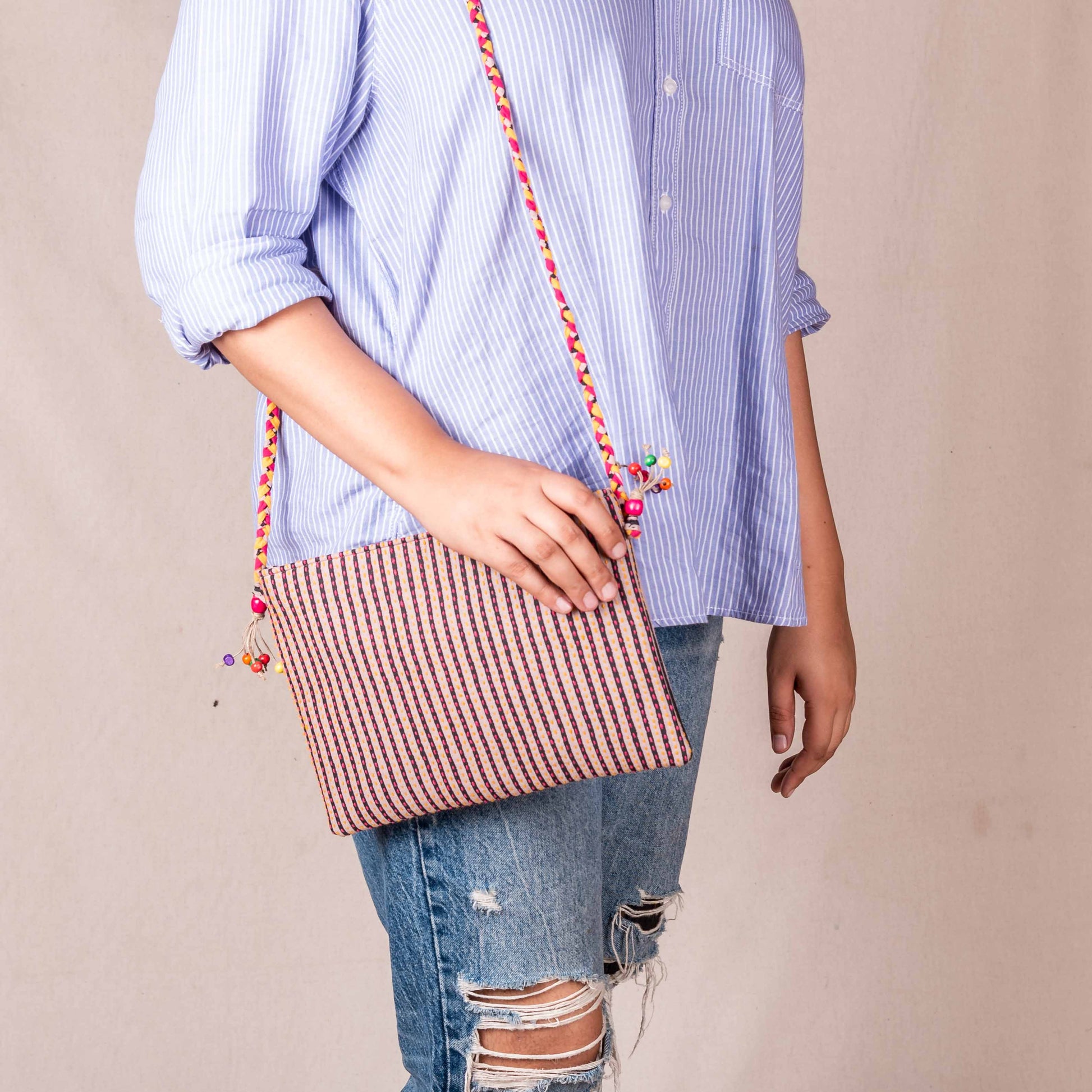 A beautiful Cotton fabric bag with a zipper on the top. This sling bag is perfect for days you want to pack light. Put your phone, lip balm, small diary or even a charger!