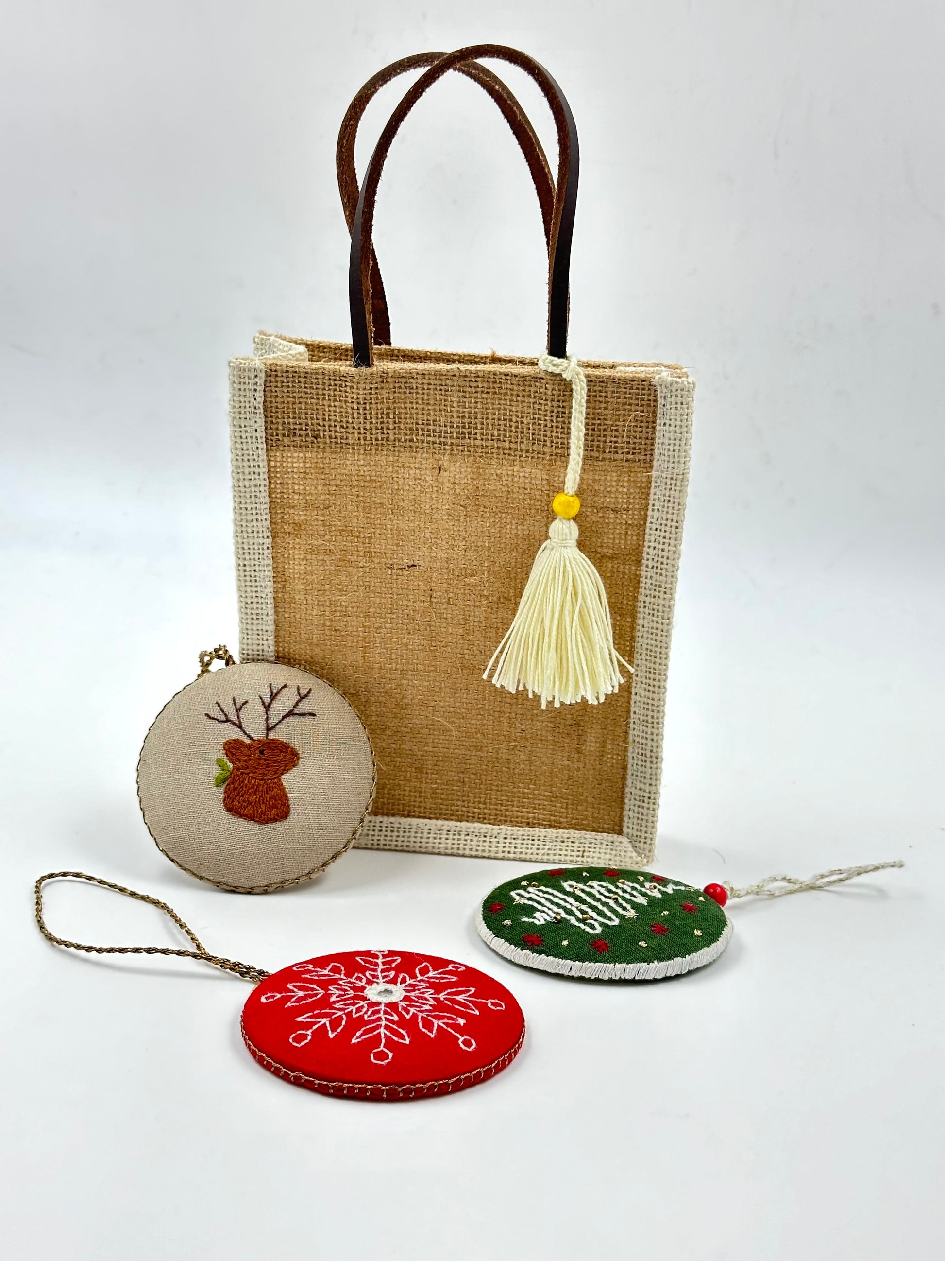 Add a touch of handcrafted charm to your holiday decor with the Festive Embroidery Trio—a set of 3-inch Christmas embroidered ornaments featuring a Christmas Tree, Snowflake, and Reindeer. Each design is meticulously hand-embroidered, bringing warmth, tradition, and artisanal elegance to your festive setup.