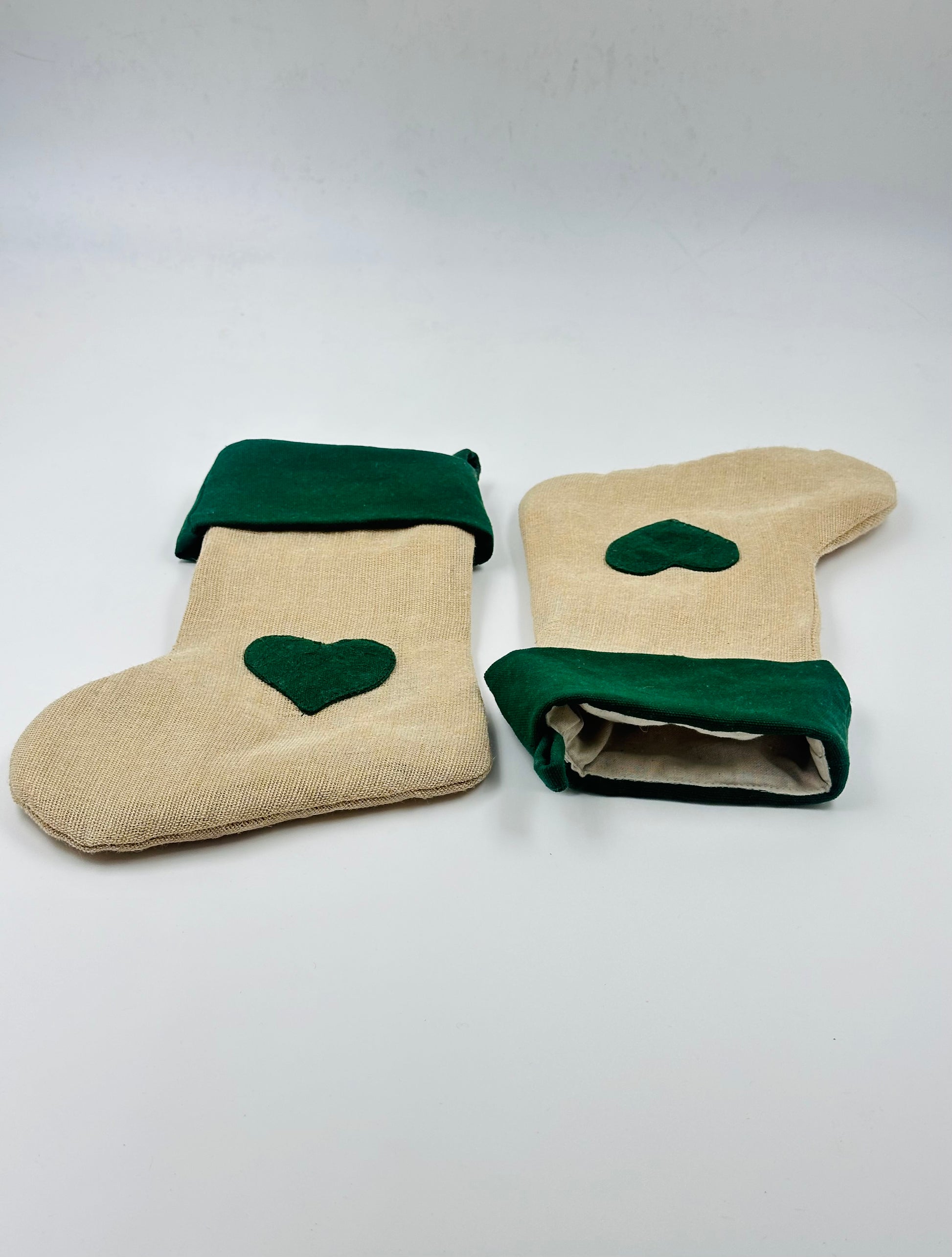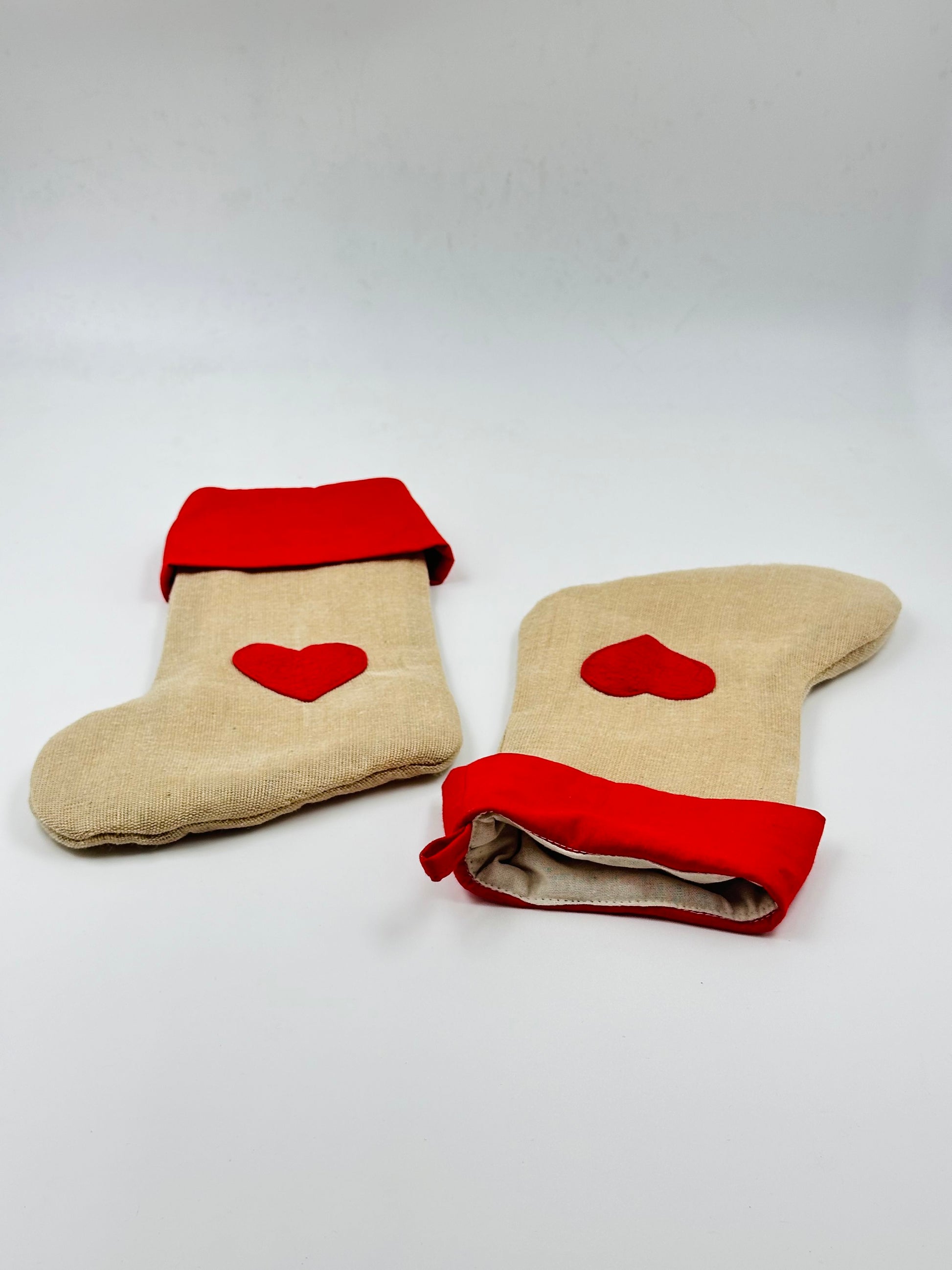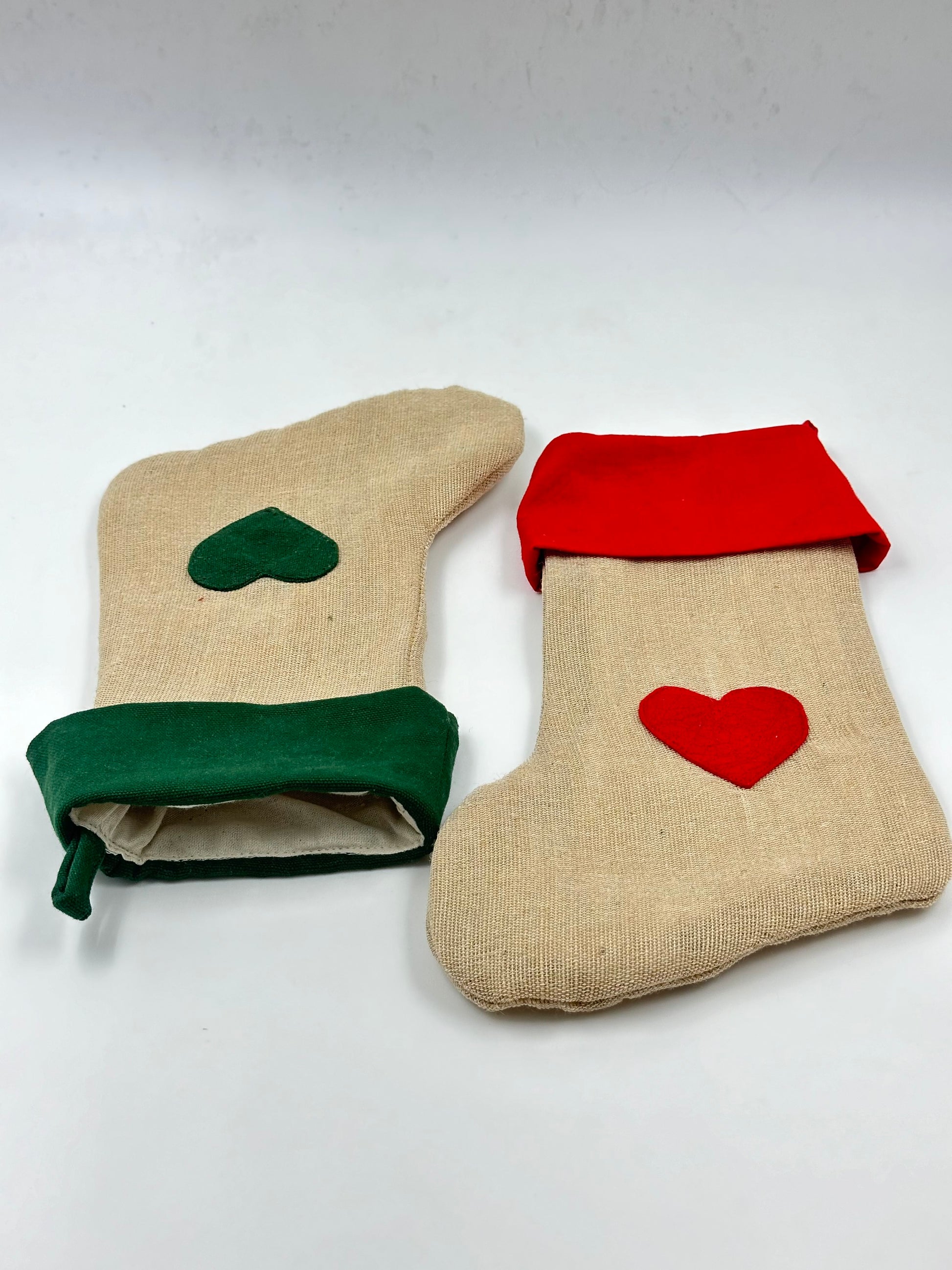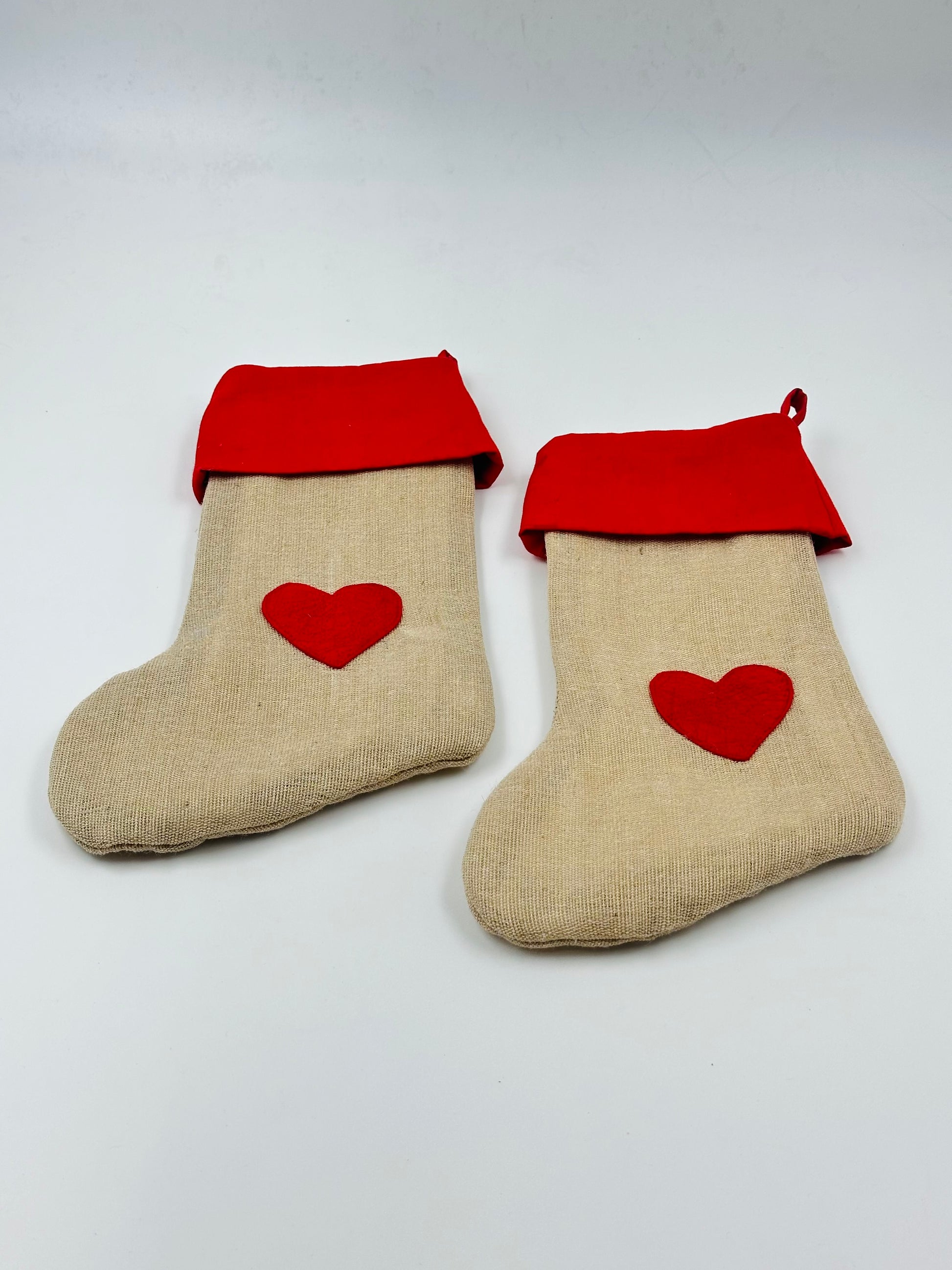 Crafted from a unique mix of jute and canvas, each stocking features a cozy fabric lining and a cute heart motif for that extra touch of charm.