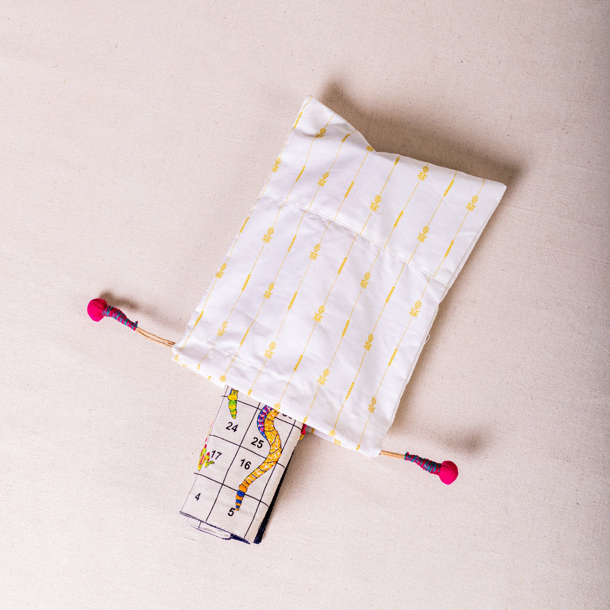 The crocheted counters in the game, 4 different coloured pieces for snakes and ladders and 10 pieces (two colour sets) for tic tac toe have been added and put in a small drawstring pouch or potli.
