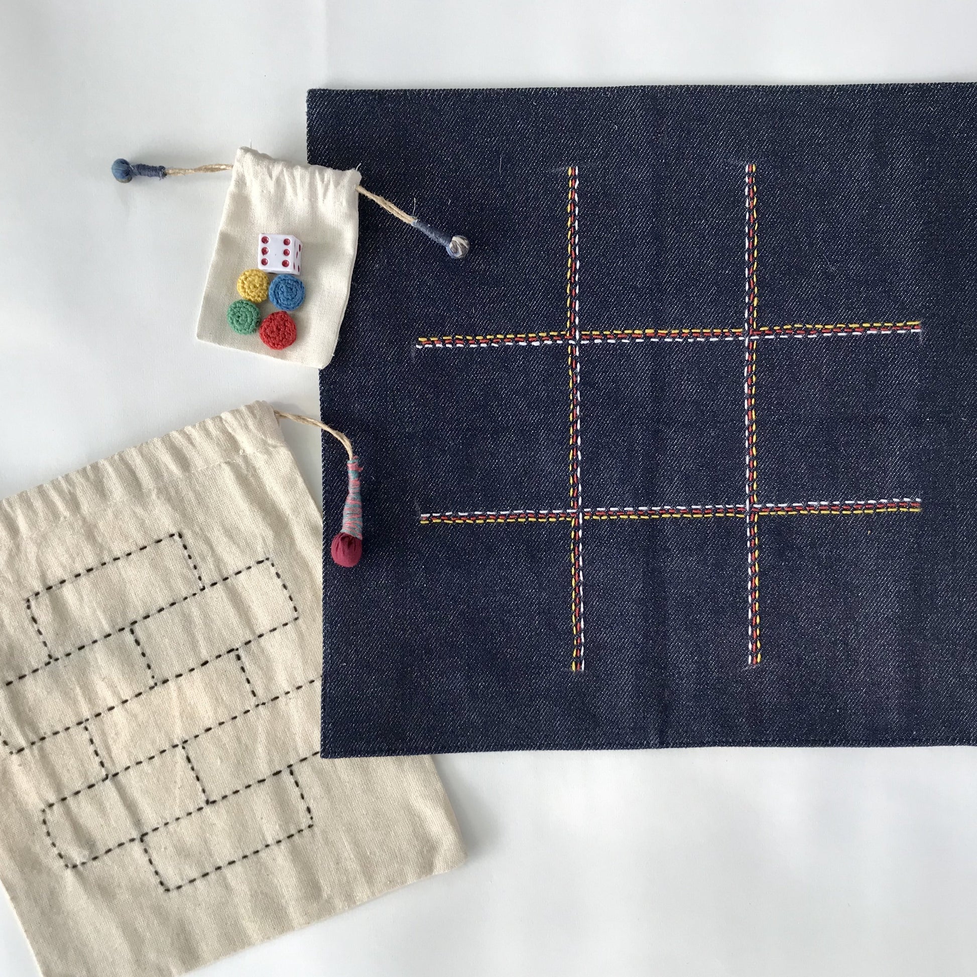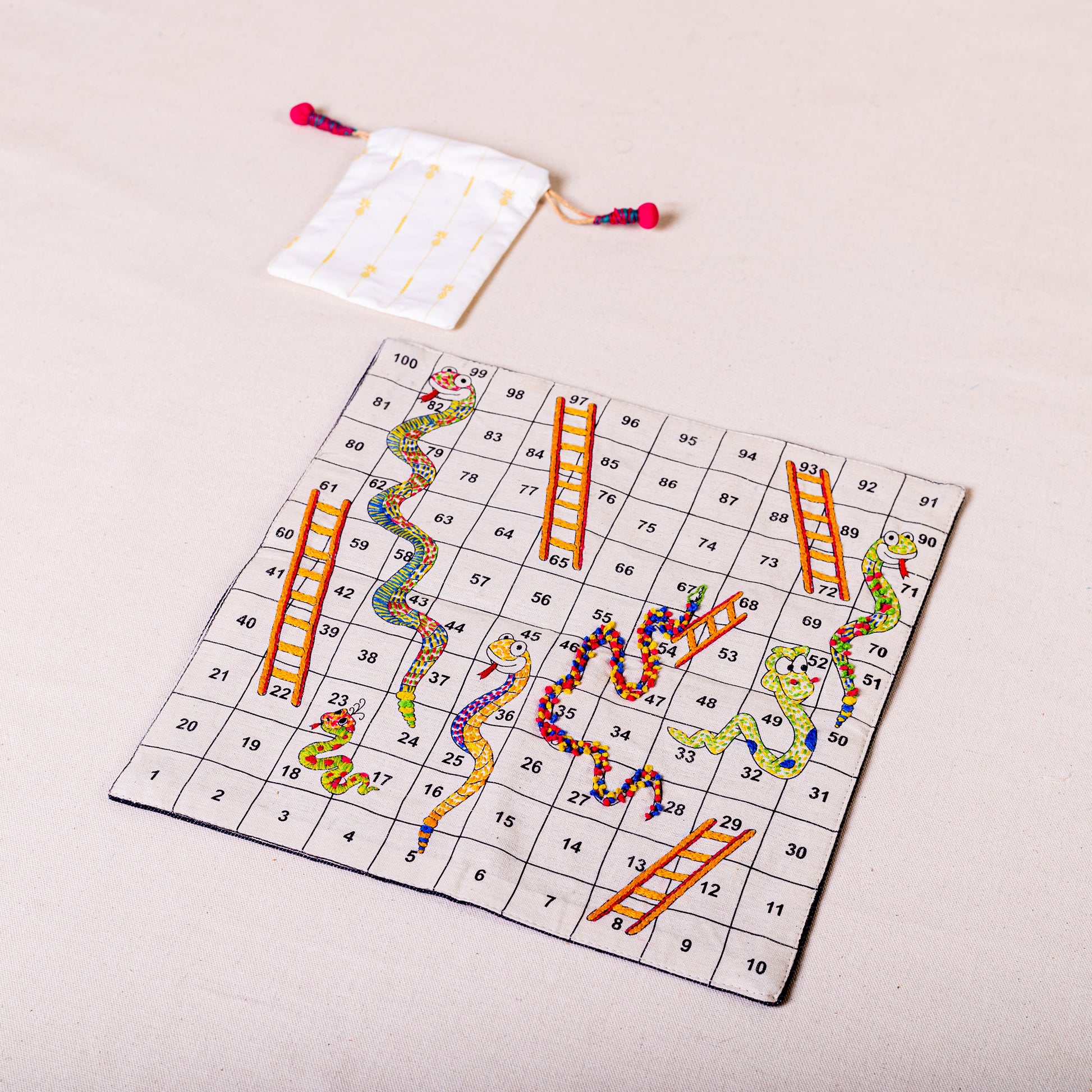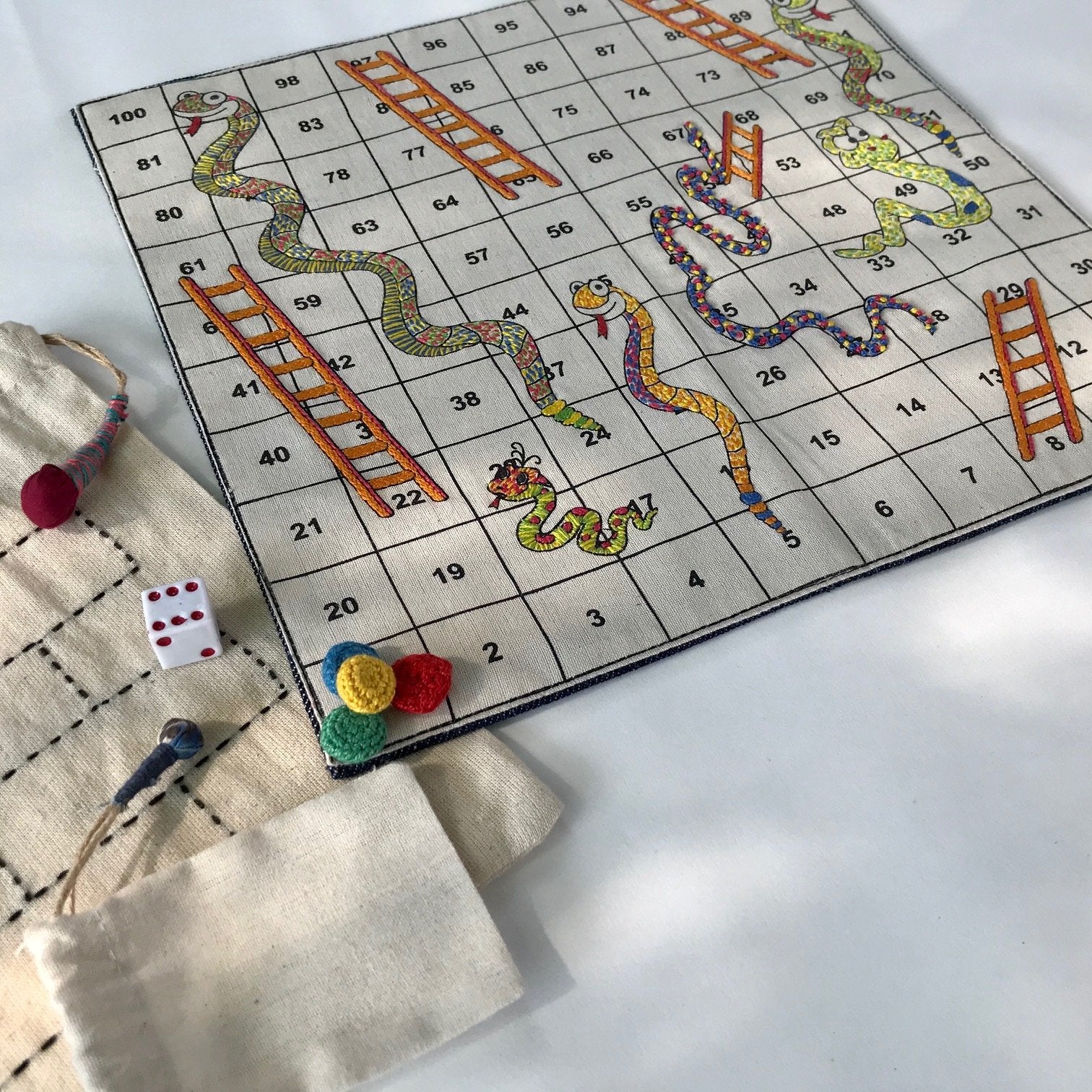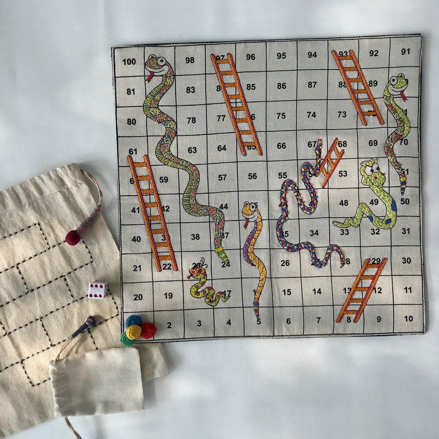 Additionally, you can enjoy snakes and ladders but the back of the game has also been embroidered to accommodate a casual game of tic tac toe.