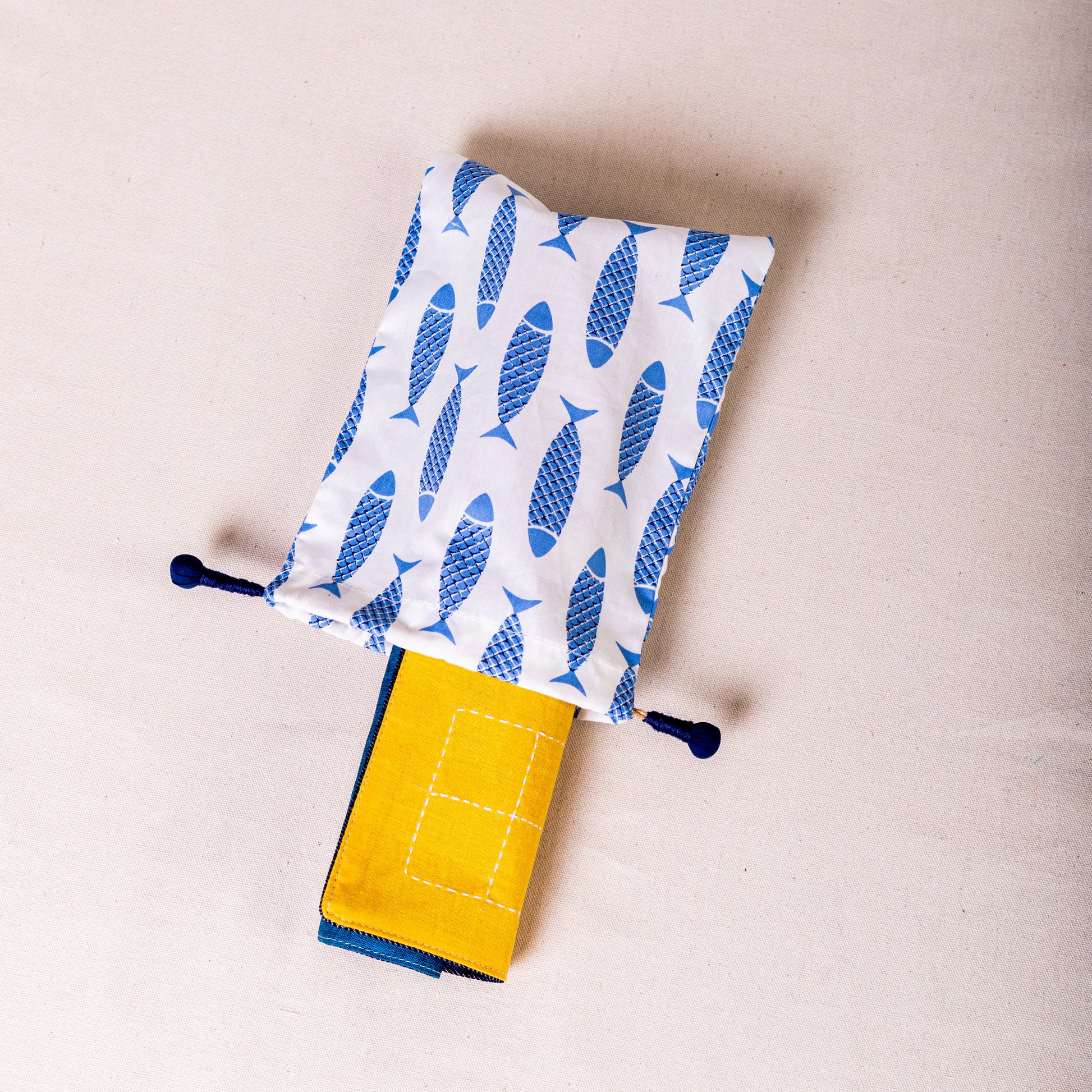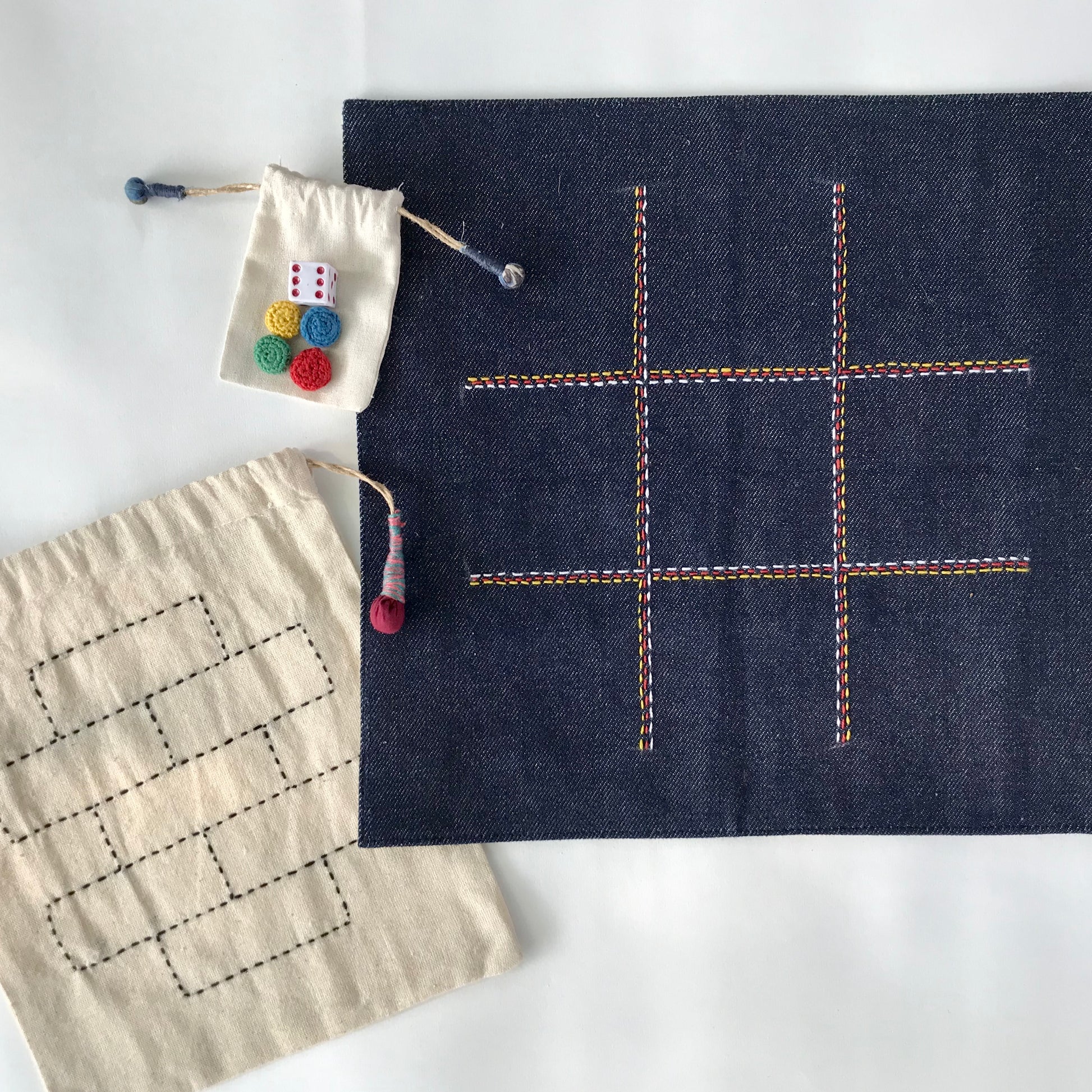 The back of the game has tic-tac-toe embroidered with colorful threads.