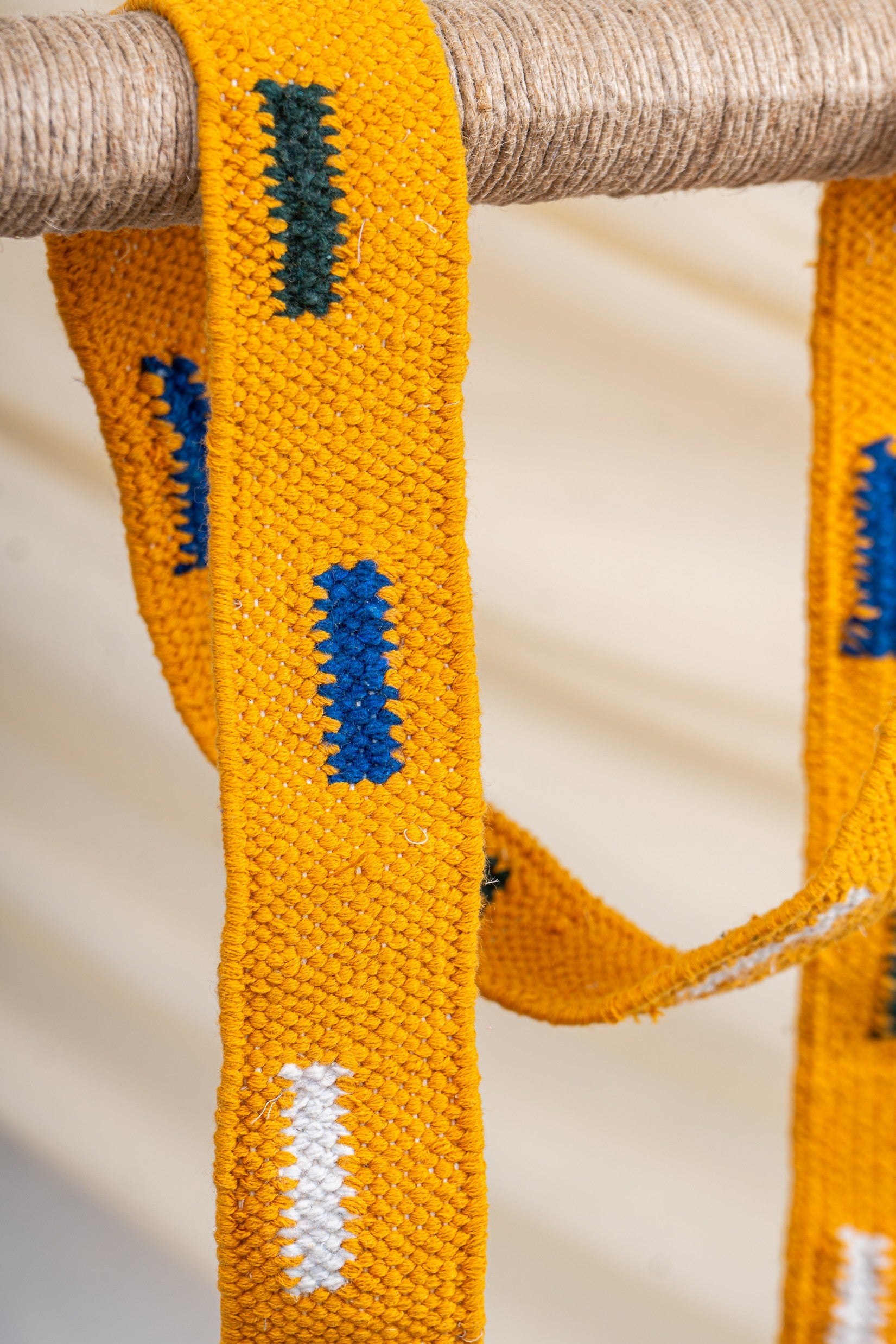 Three variants are woven using pre-consumer fabric waste strips, giving new life to textile leftovers. The yellow strap is woven using cotton dari threads.