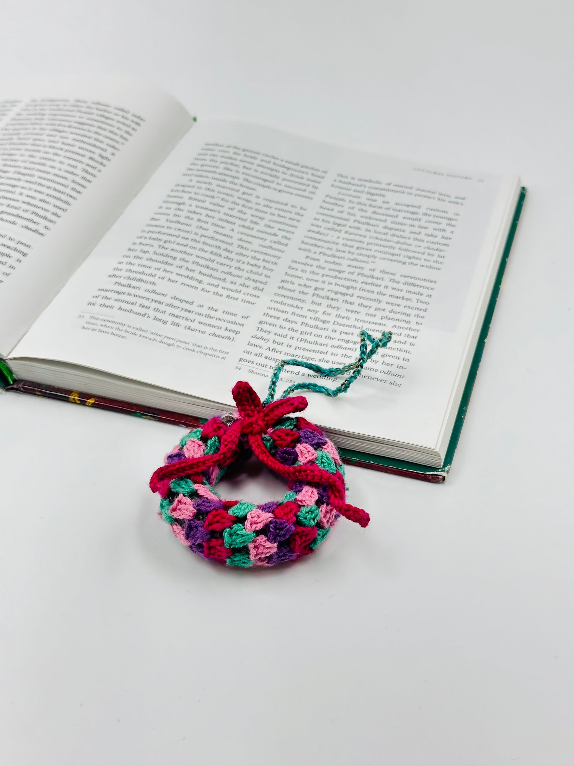Add a touch of handmade charm to your holiday decor with our Merry Blooms Mini Wreath! This 2.25-inch ornament is intricately crafted in crochet, featuring a vibrant blend of Christmas colors—red, green, pink, and purple—woven into a delicate floral wreath. Perfect for hanging on your Christmas tree, adorning gift packages, or as a festive table decor accent.
