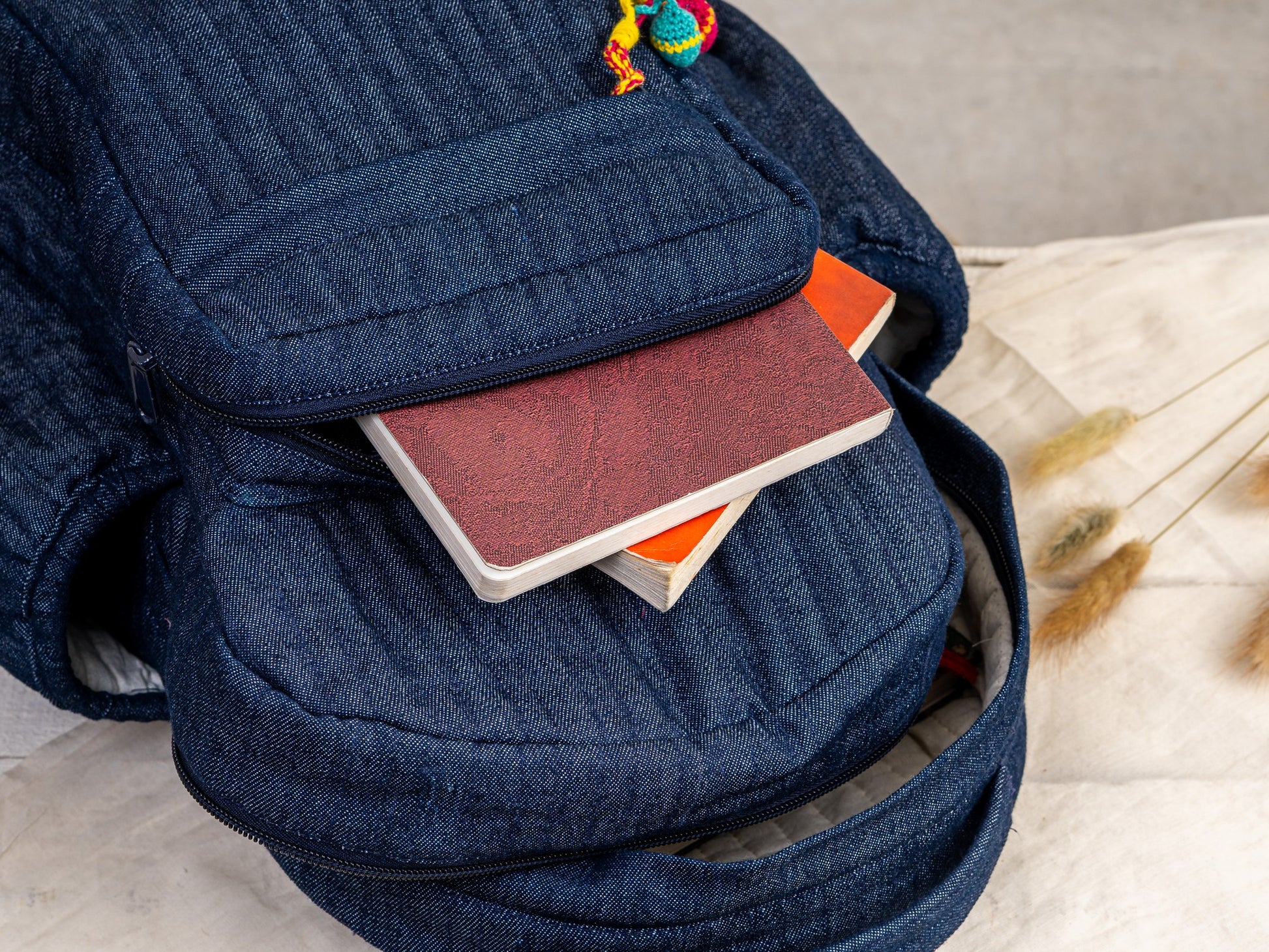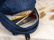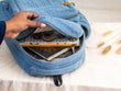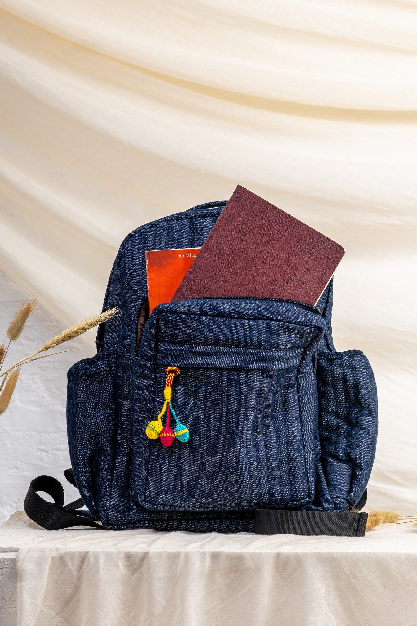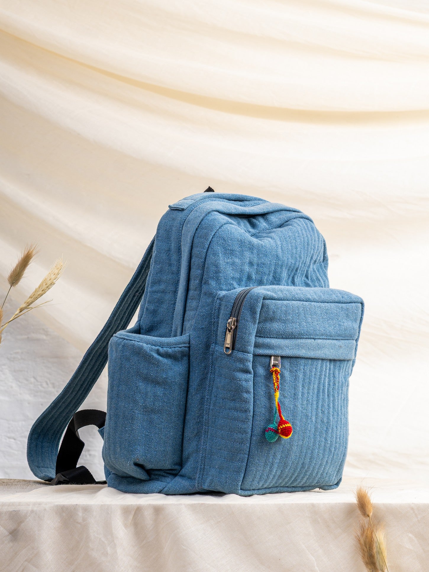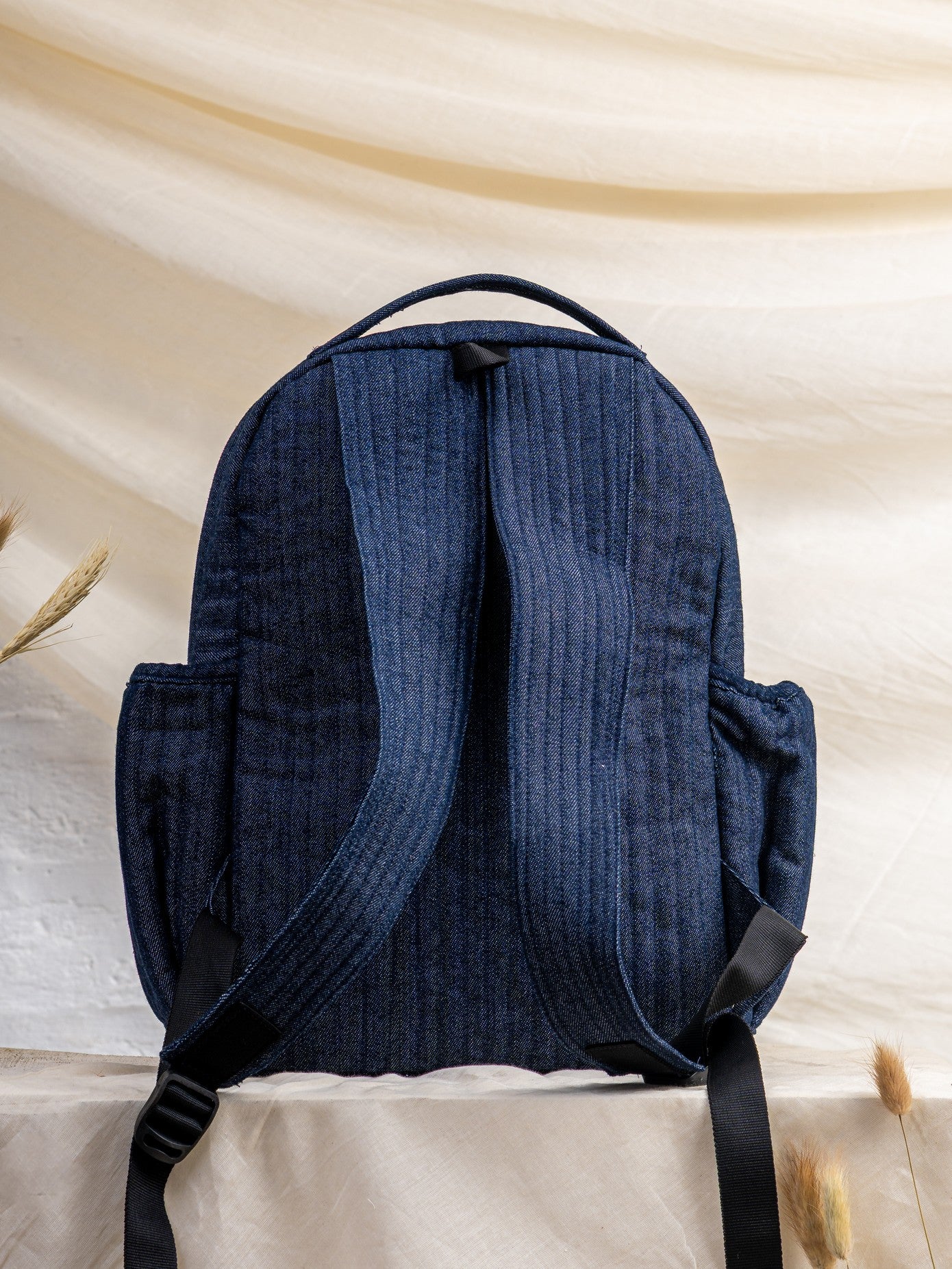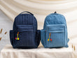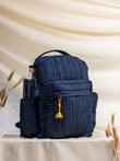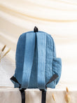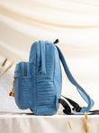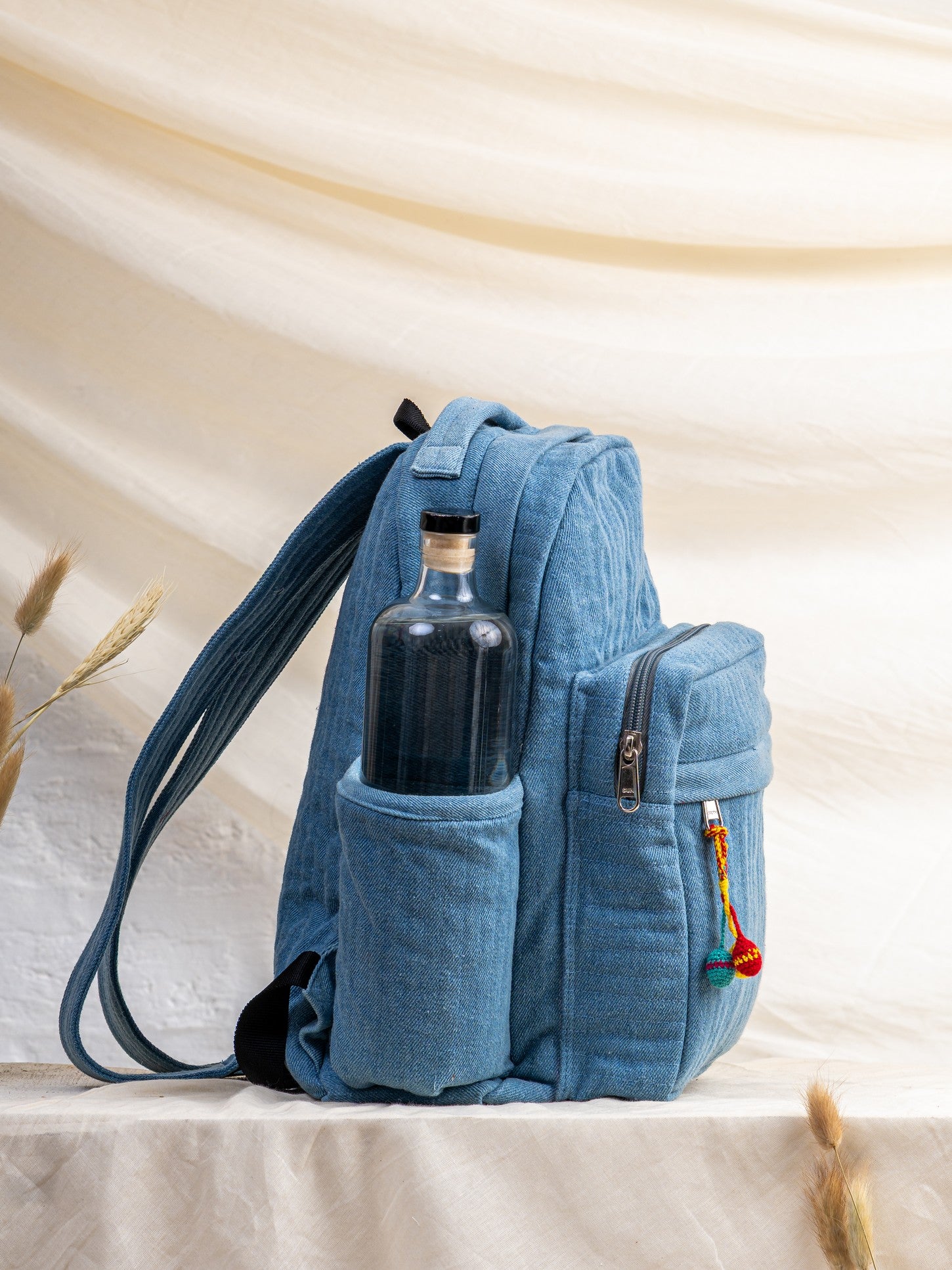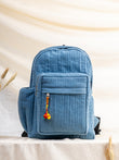 Spacious main compartment, front zip pocket, side bottle pockets, adjustable shoulder straps, quilted denim body.