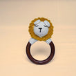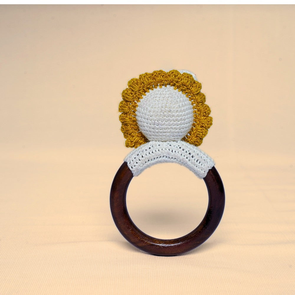 Don’t be fooled by the mane — Napoleon is the gentlest lion you’ll ever meet. With his eyes closed in blissful slumber and a soft rattle tucked inside, this handcrafted crochet lion is made for cozy cuddle time and quiet jingles. His wooden ring makes it easy for tiny fingers to hold on, shake with delight, or simply carry him along on everyday baby adventures.