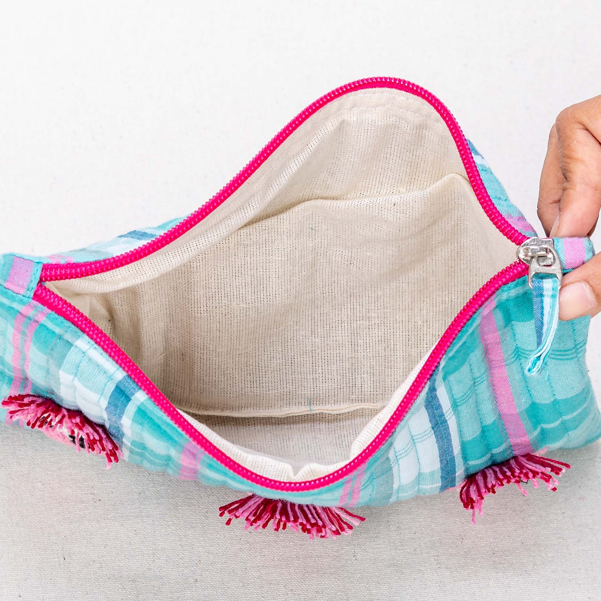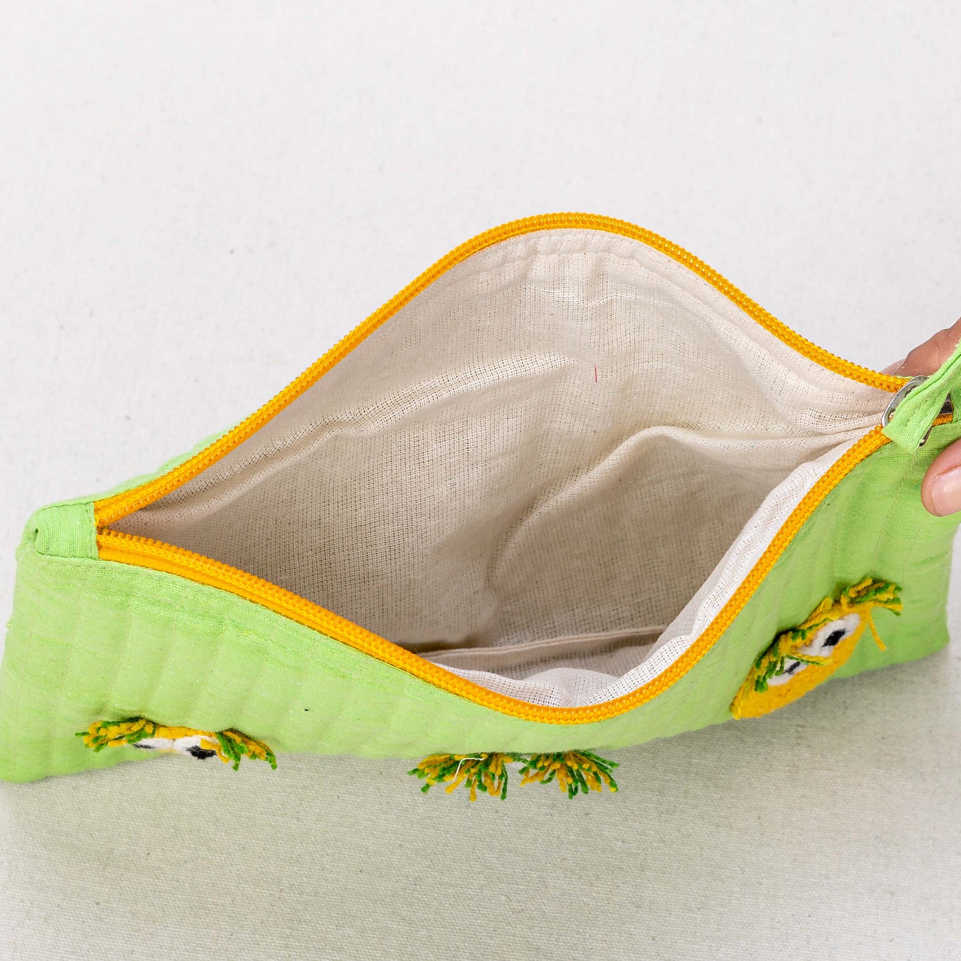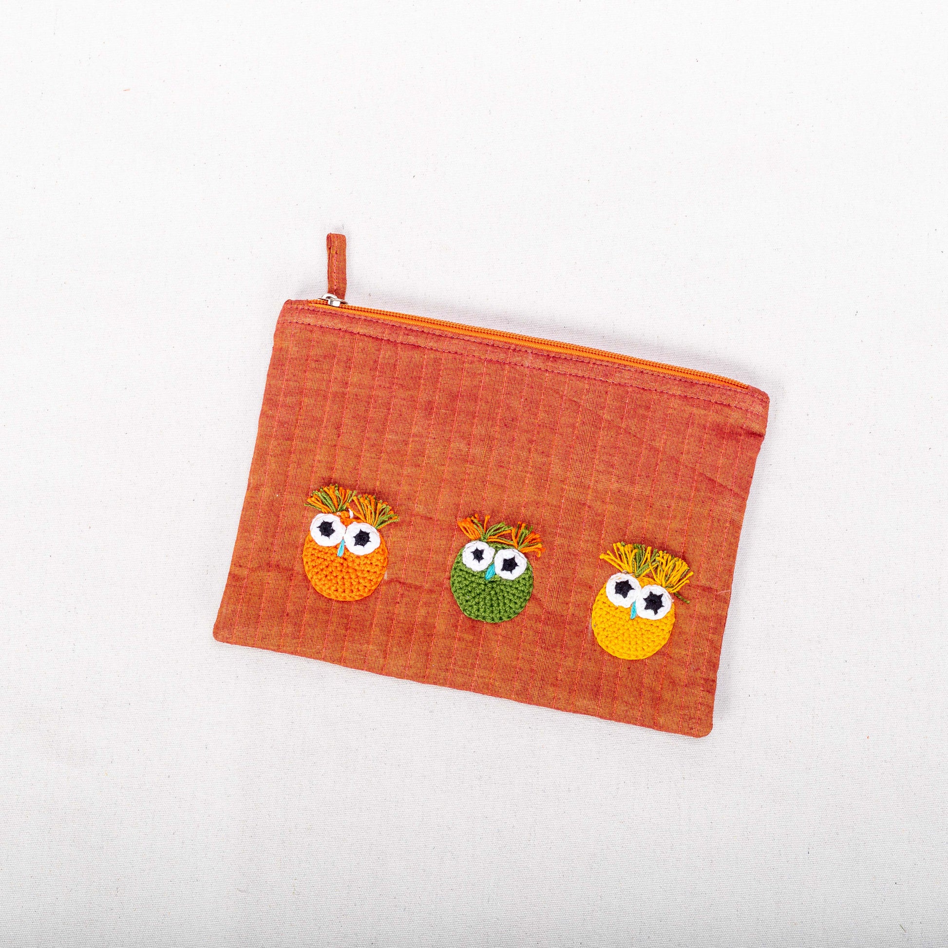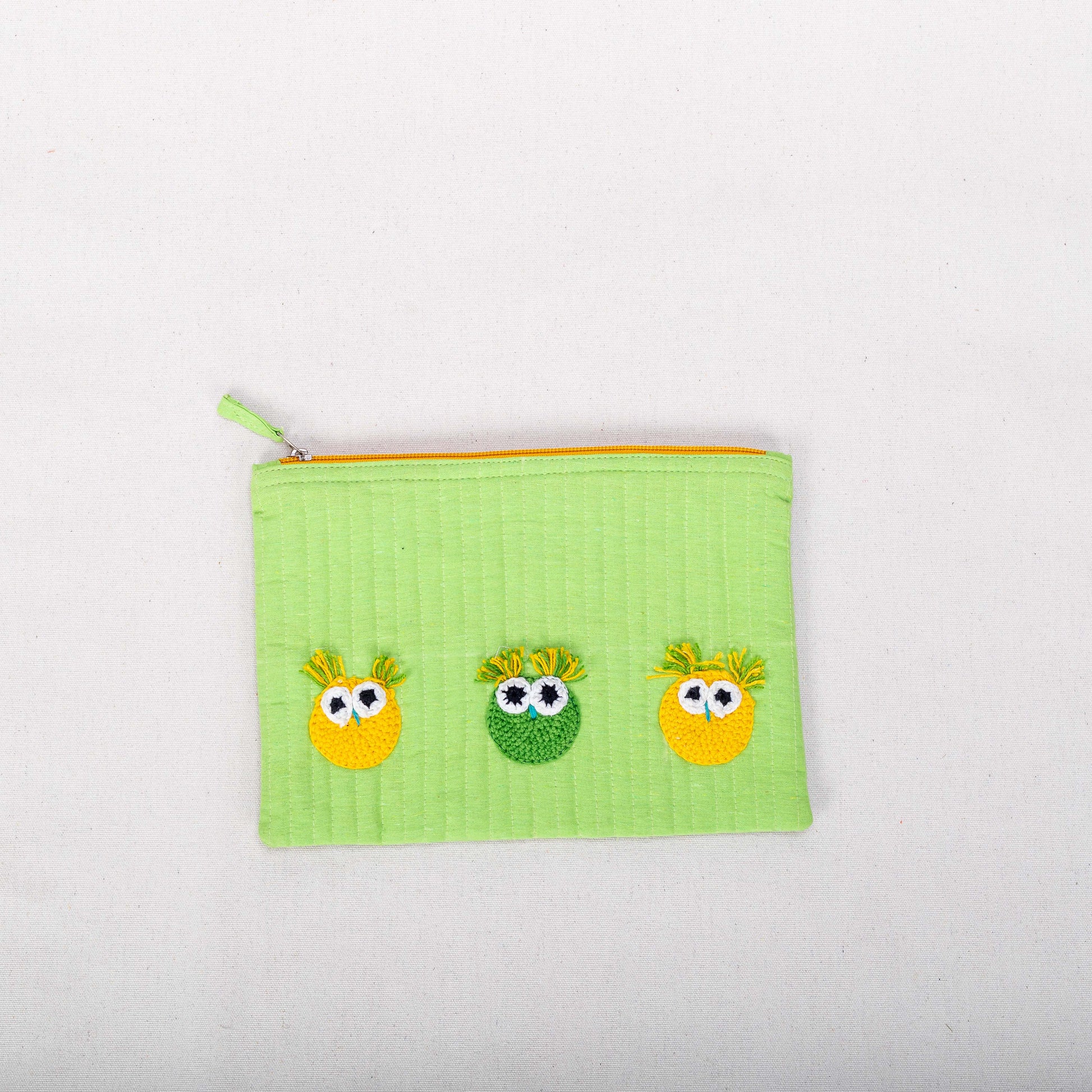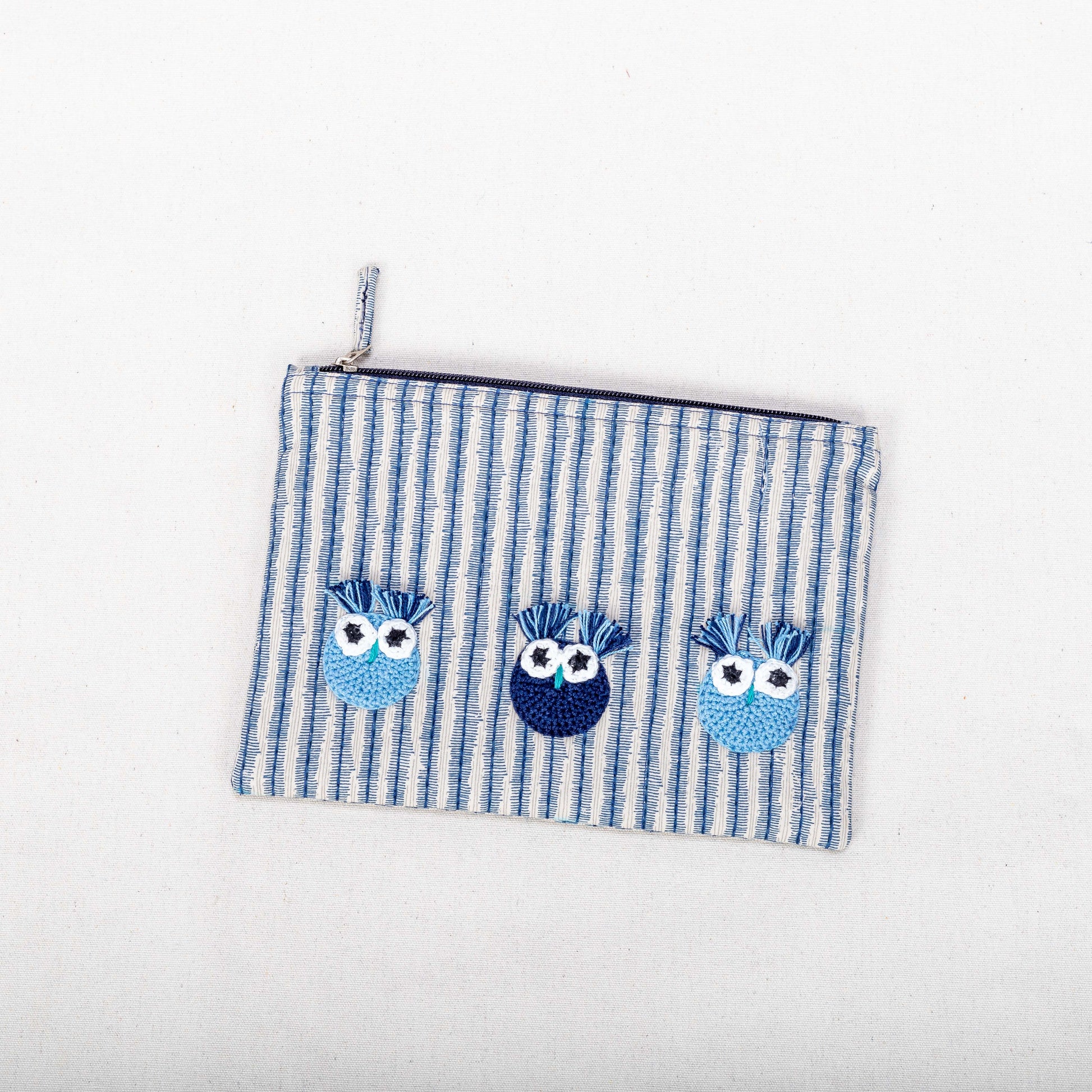 This one is too cute to miss! A pretty fabric with crochet owl faces done, this pouch is best for your small essentials to fit in. Slide in a mask, lip balm and some currency.