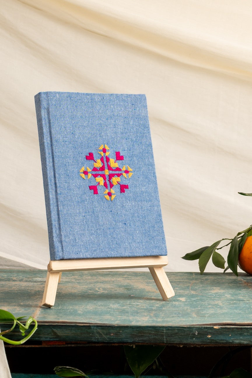 This journal carries a classic phulkari flower motif, hand-embroidered in vibrant pink and yellow threads against a calming blue base. The placement is intentional — centered, balanced, and bold — like a quiet statement that doesn’t need to shout.