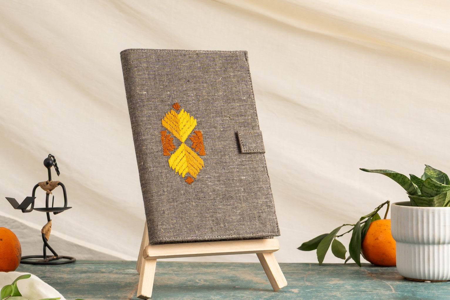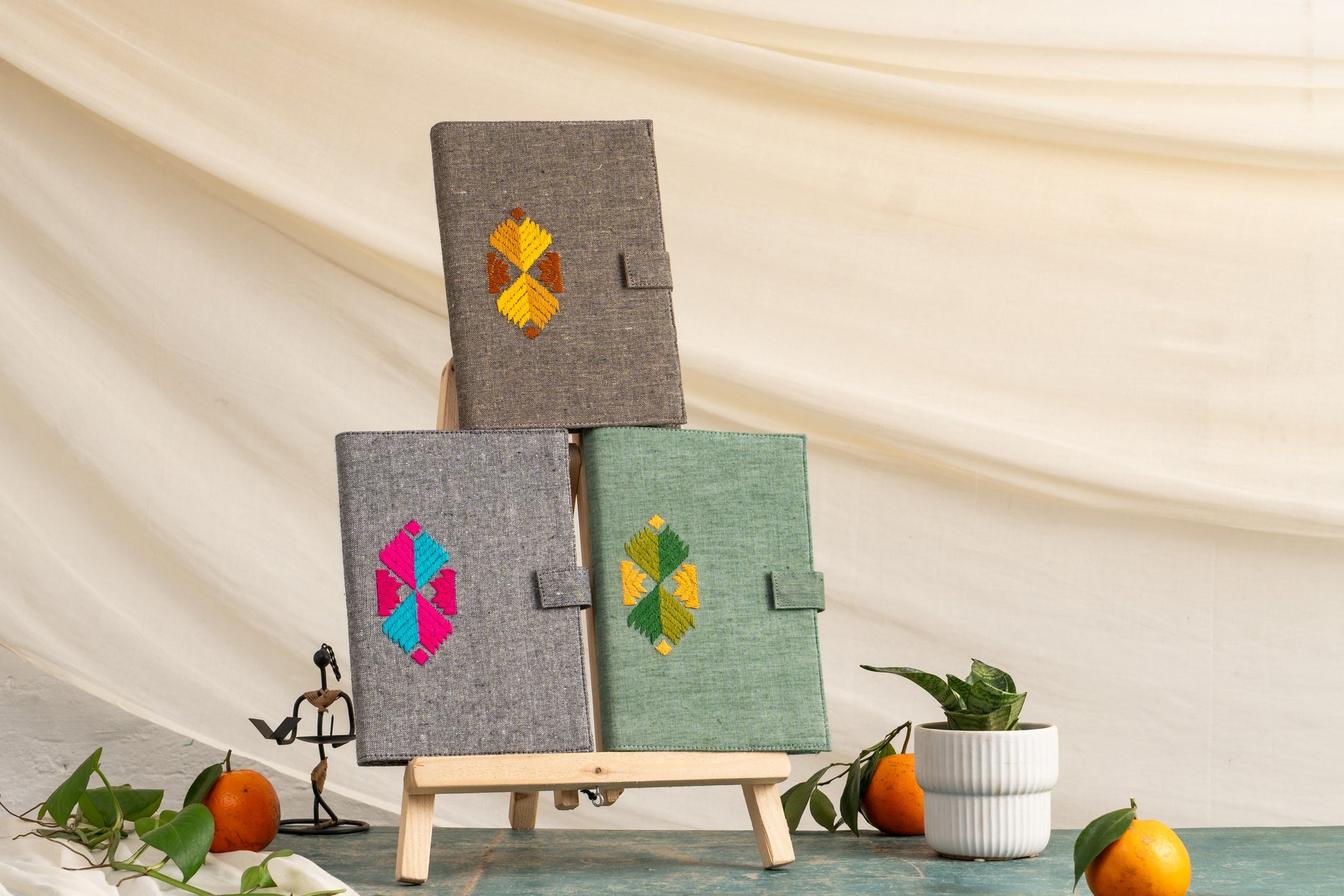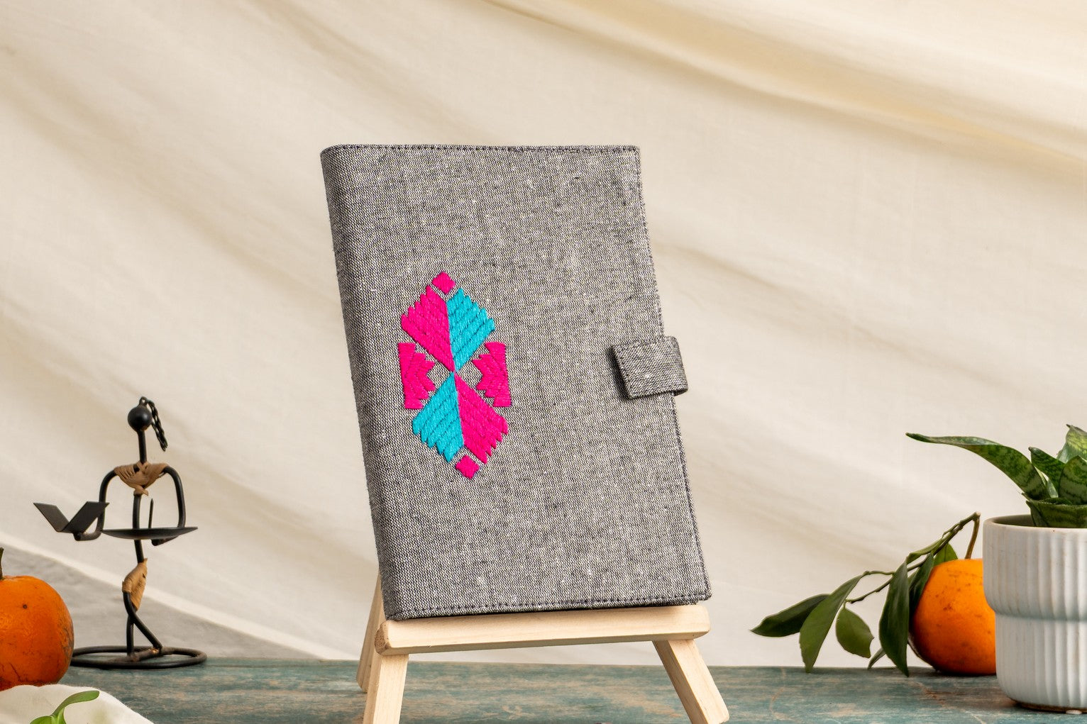 This journal features a bold geometric Phulkari-inspired motif placed slightly to the side — breaking symmetry in the most beautiful way. The embroidery is sharp, structured and rooted in traditional phulkari stitch language, but adapted for a clean, contemporary look.