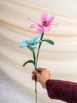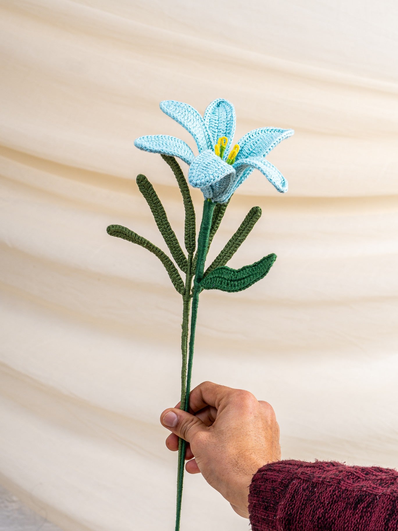 Quiet Grace is our hand-crocheted lily—open, balanced, and gently expressive. With its soft petals and thoughtful detailing, this flower feels poised and reassuring, like a deep breath on a busy day. Whether you choose a single stem, a pair, or add a crochet leaf for a fuller look, it brings elegance without excess.