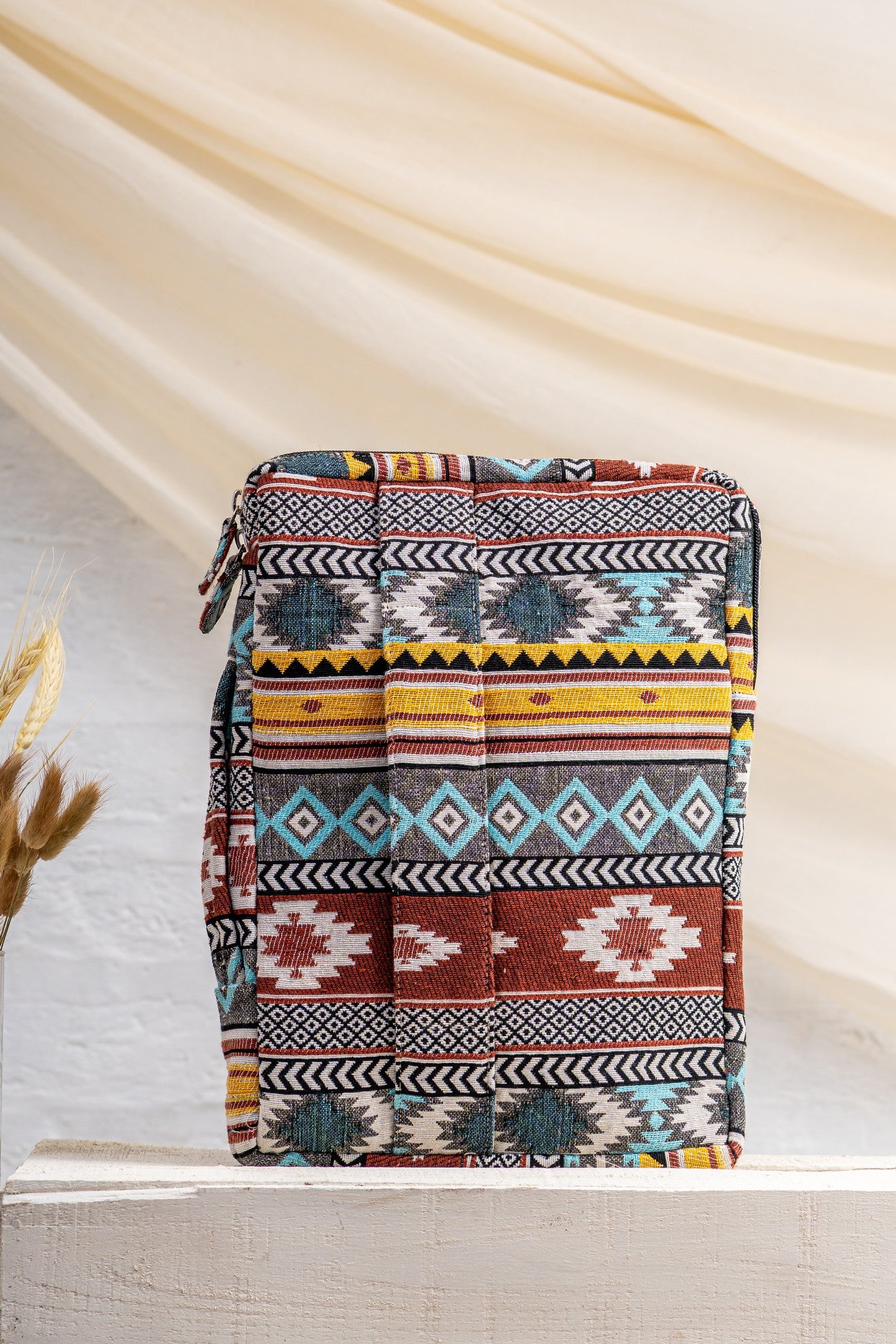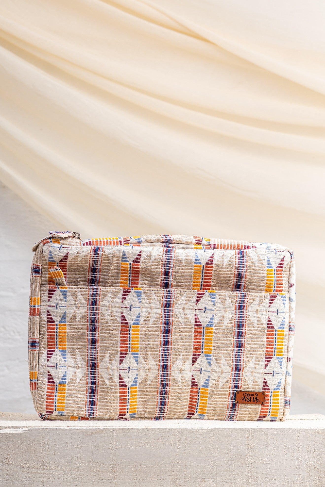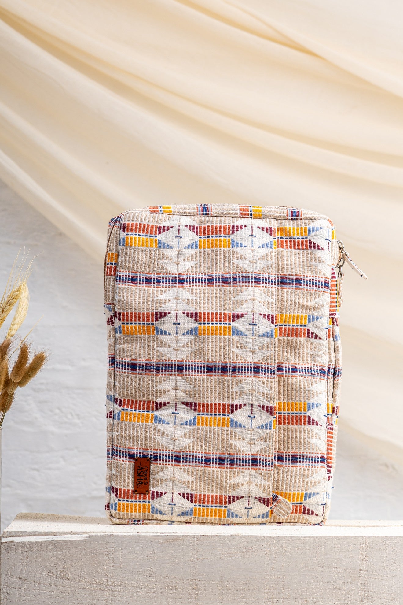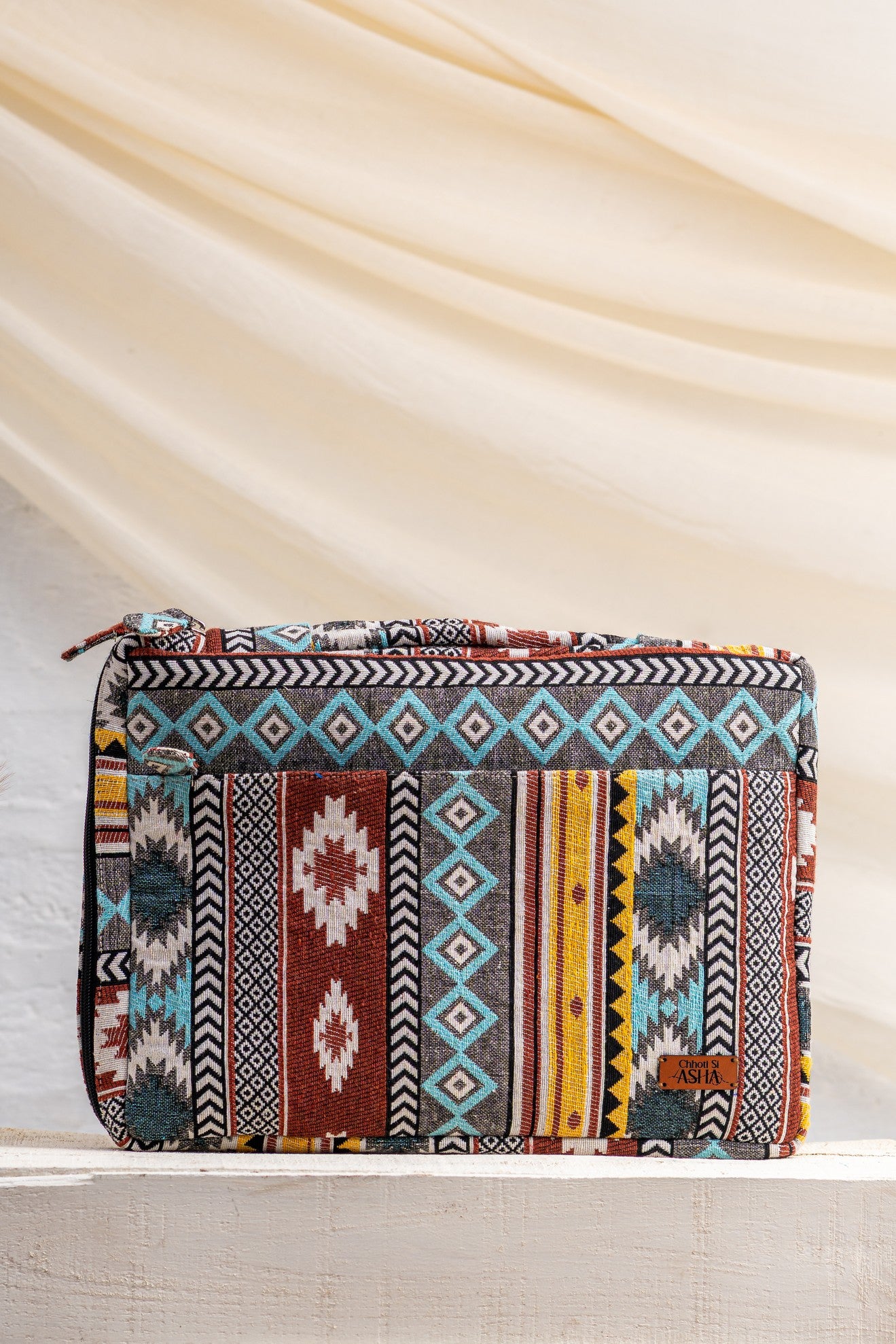 The Sahiba Laptop Sleeve – Jacquard blends structure with woven character. Crafted in textured jacquard fabric with bold geometric patterns, it carries heritage in a clean, contemporary form.