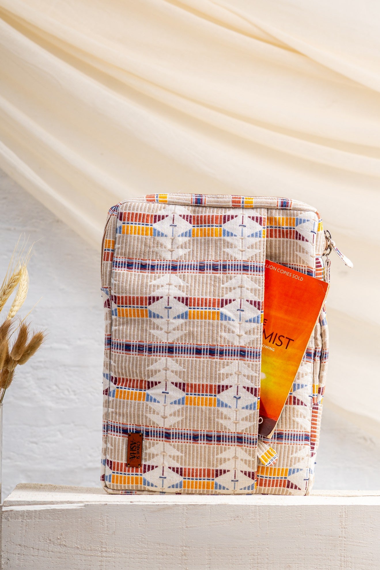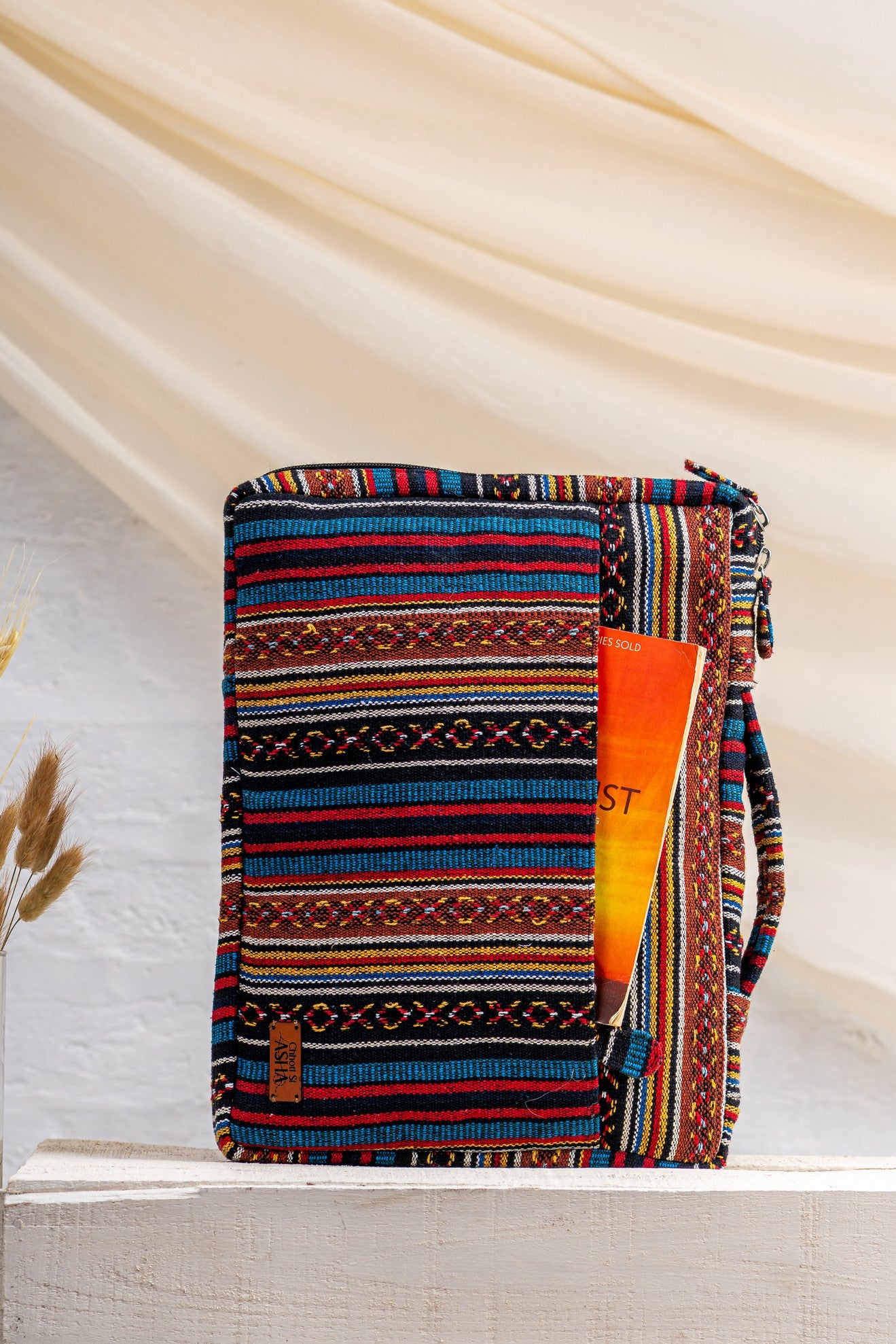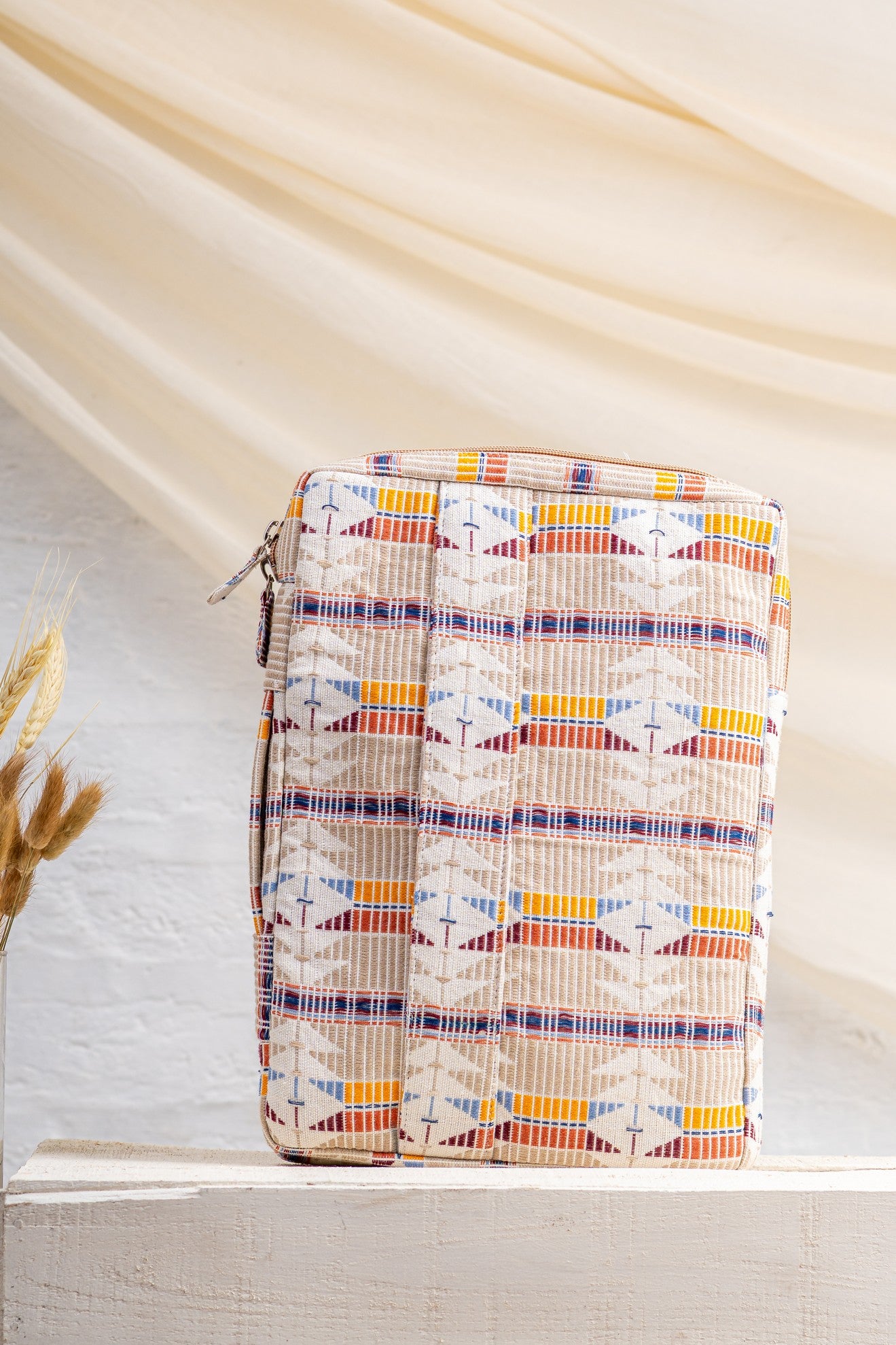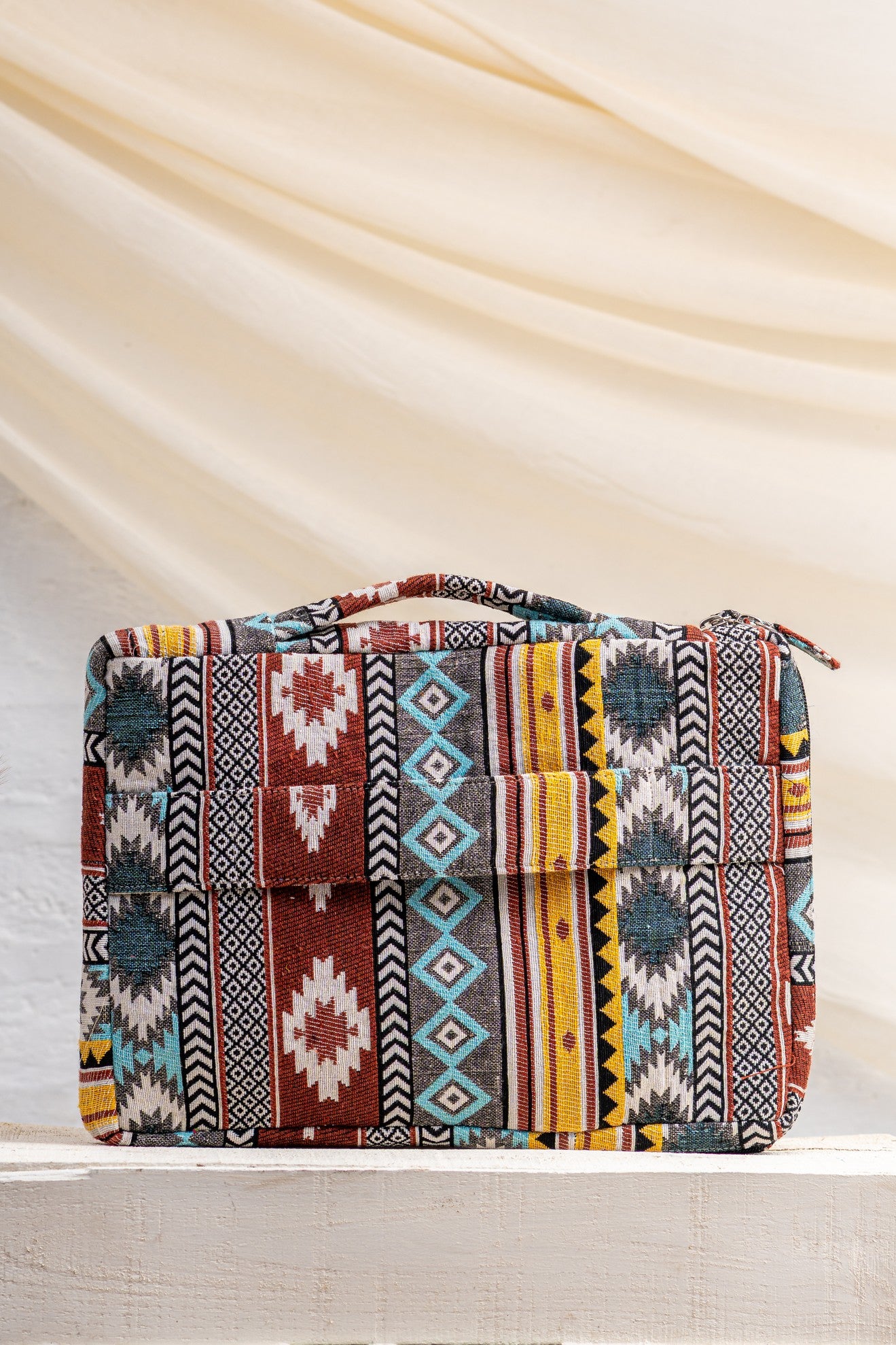 The Sahiba Laptop Sleeve – Jacquard blends structure with woven character. Crafted in textured jacquard fabric with bold geometric patterns, it carries heritage in a clean, contemporary form.