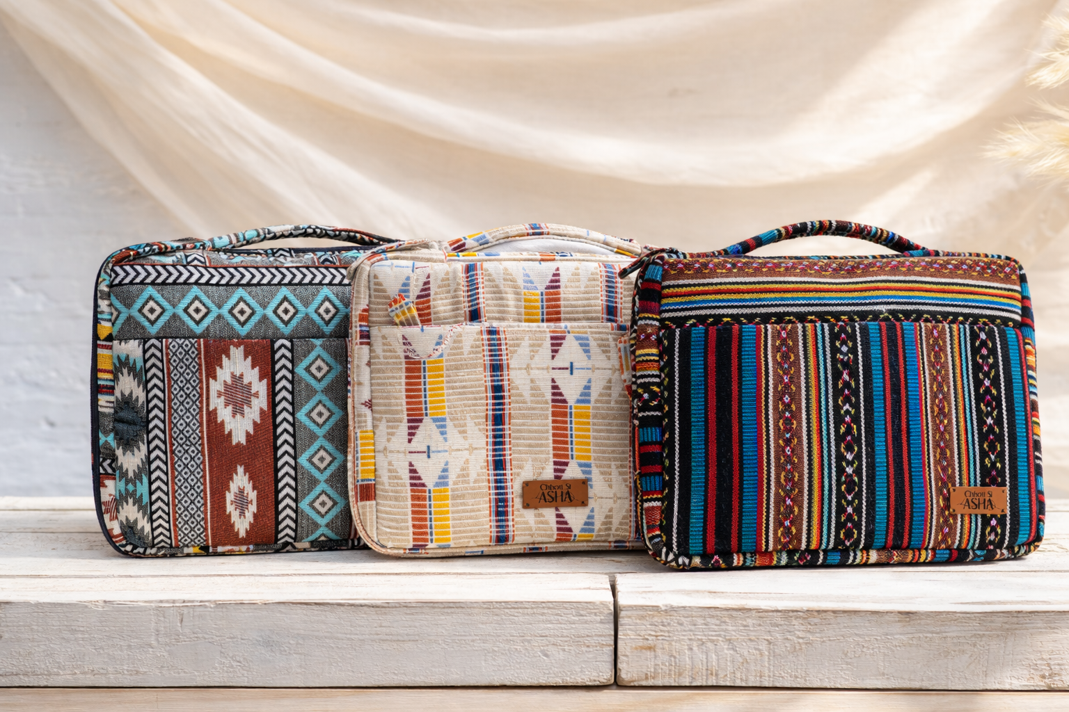 • Nomad – Deep tones with bold tribal-inspired motifs in teal, rust and charcoal. Graphic, confident, and travel-ready.