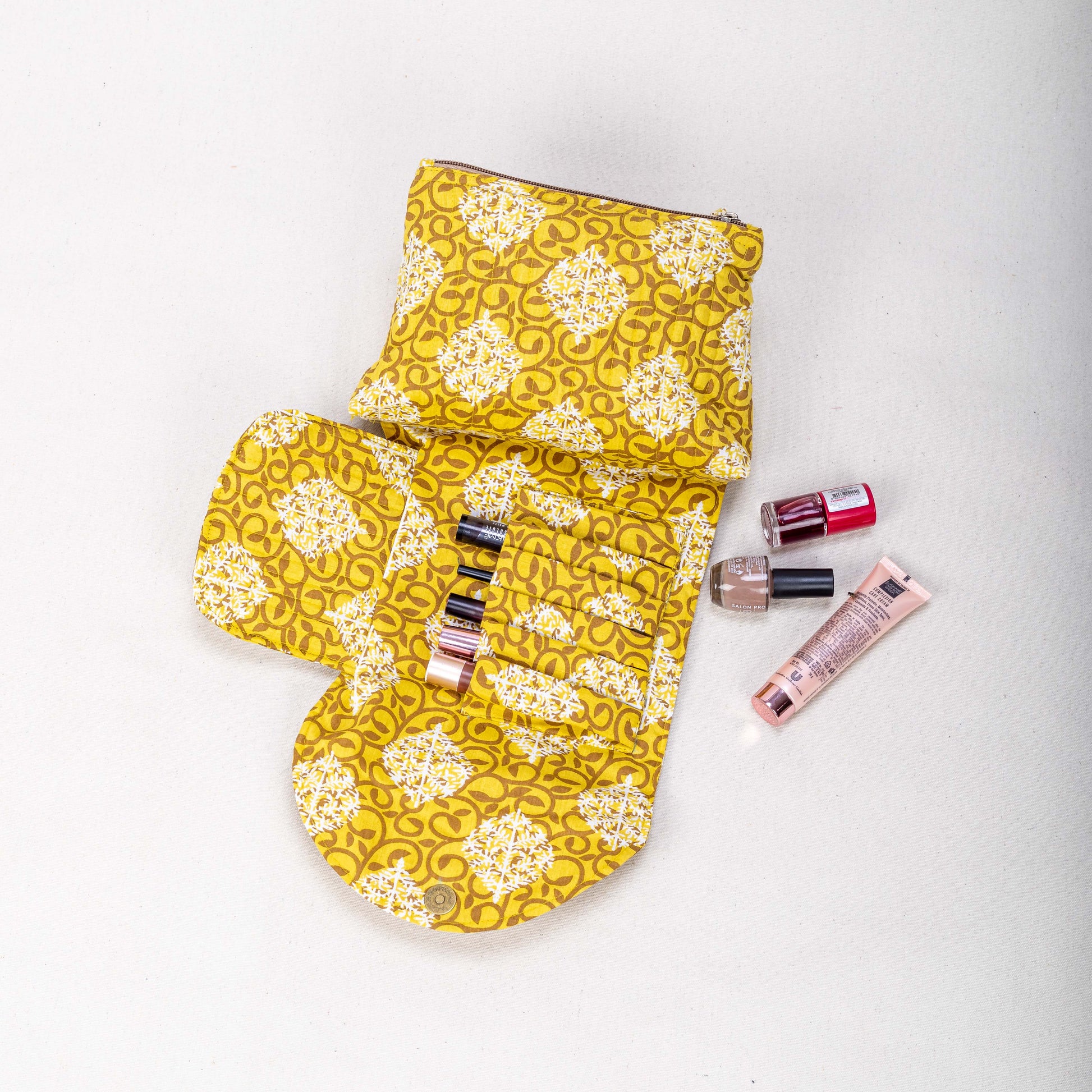 Handcrafted by Artisan - Seema, it's not just spacious, it's practically limitless. Designed to accommodate everything you need, from your favorite foundations and brushes to your go-to lipsticks and eyeshadow palettes, this makeup bag has ample room for all your beauty essentials.