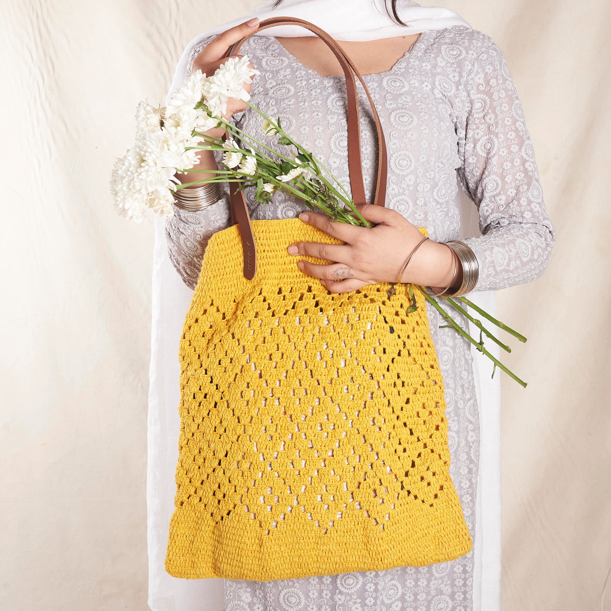 This bag in yellow crochet work adds a pop of texture and personality to your outfit. It's roomy enough to hold all your essentials, whether you're heading to the beach, running errands, or meeting friends for brunch.