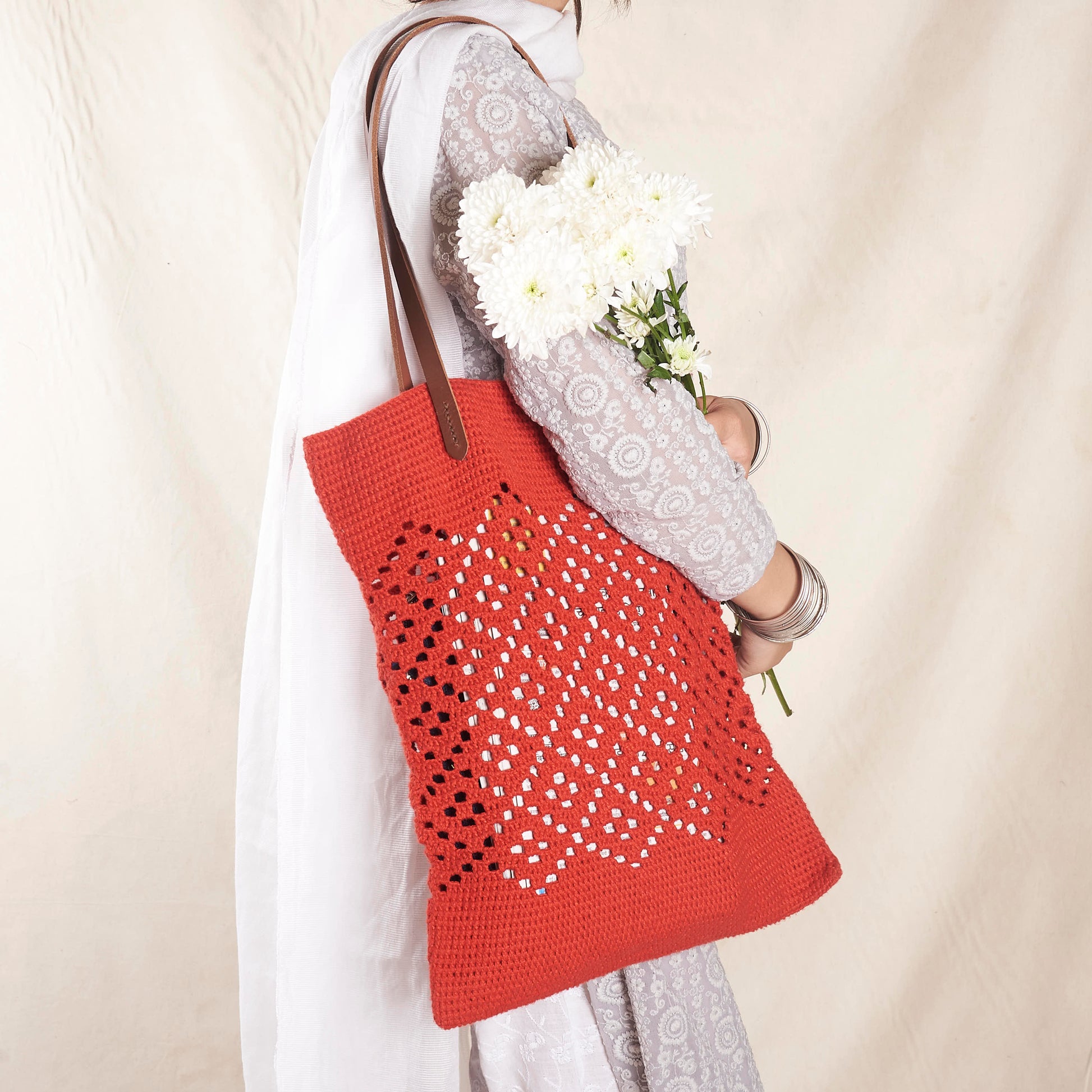 This bag in red crochet work adds a pop of texture and personality to your outfit. It's roomy enough to hold all your essentials, whether you're heading to the beach, running errands, or meeting friends for brunch.