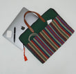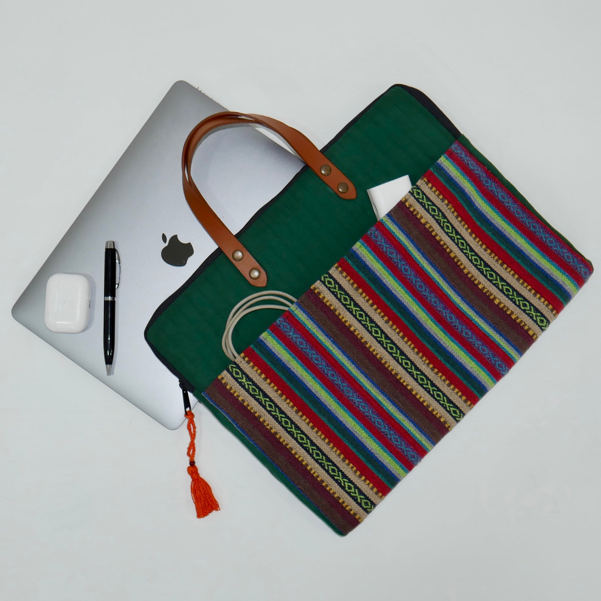 A sleeve that stands out without shouting. This version of the Swaran Sleeve is made with quilted green salab fabric, paired with a vibrant jacquard front pocket in multicolour stripes. The zippered pocket keeps your accessories safe, while the leather handles and bright tassel add just the right touch of detail.