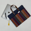 A bold sleeve that means business (and style). Made in quilted denim, this Swaran edition features a vibrant multicolour jacquard panel in the front—now as a zipped pocket to keep your essentials secure. With sturdy leather handles and cheerful contrast tassel, it's a great pick for everyday work or travel.