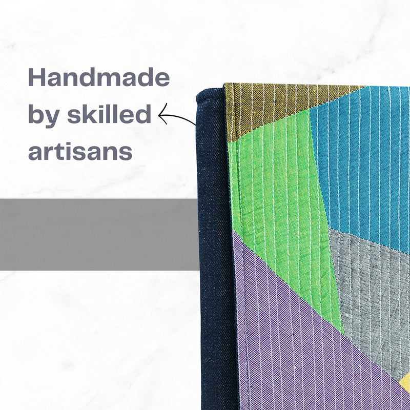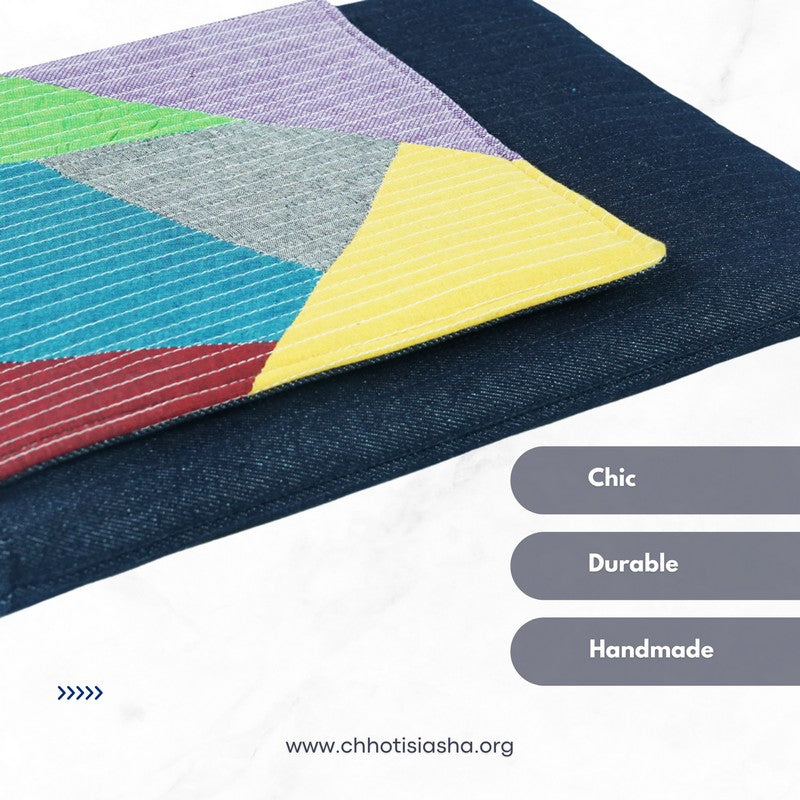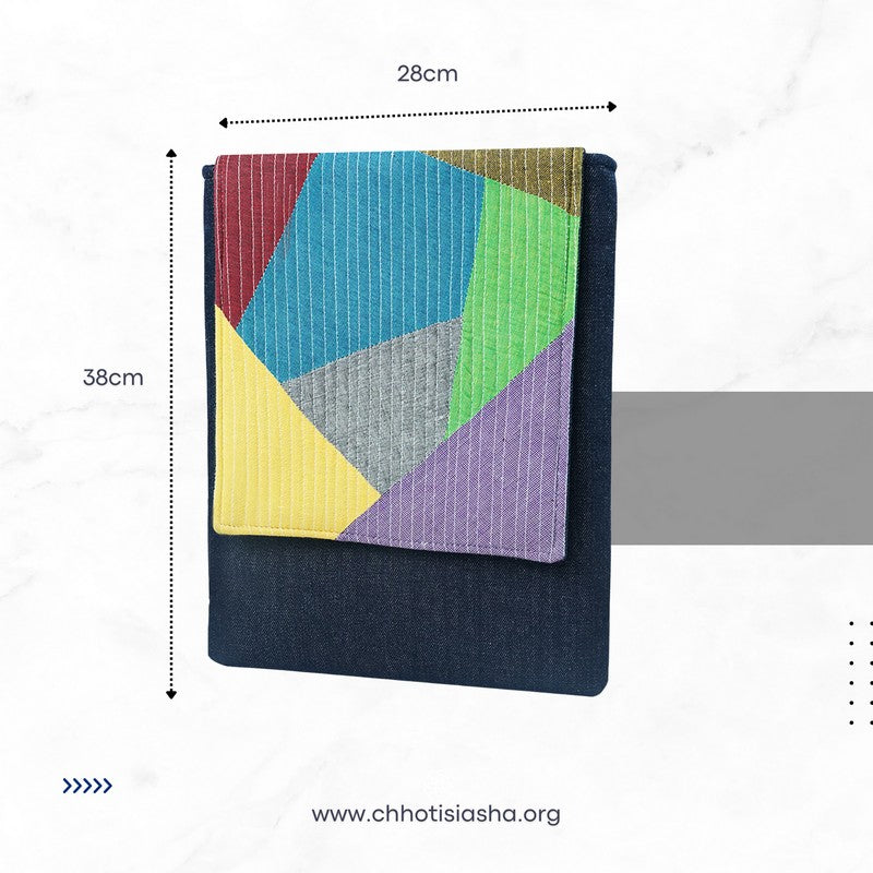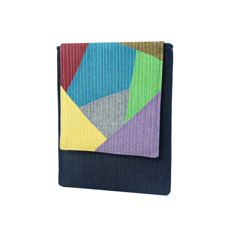 Bold on the flap, classic on the body—this vertical laptop sleeve blends patchwork play with everyday ease. The flap features colour-blocked South cotton pieces, stitched into geometric shapes and quilted for texture. The rest of the sleeve is made in sturdy denim for a sleek and functional finish. A great pick for someone who likes their work gear with a bit of personality.