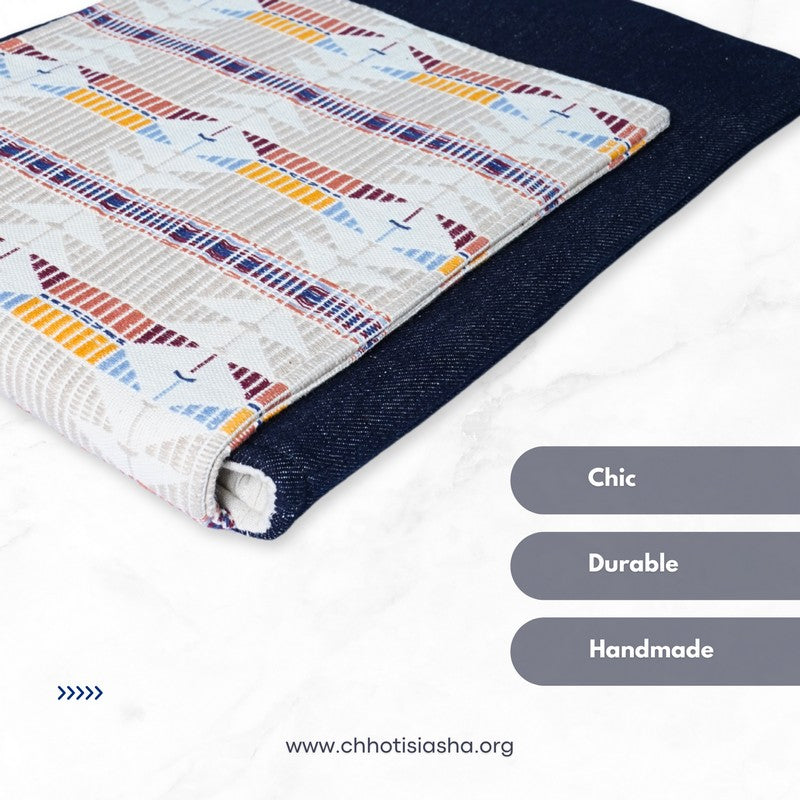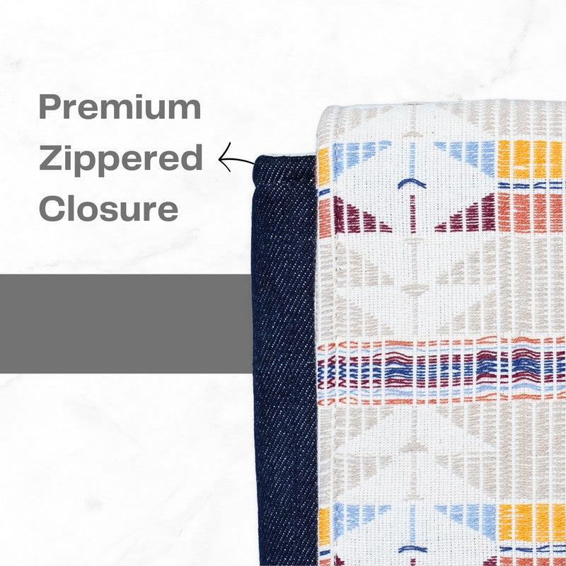 A gentle palette of creams, blues, and rusts meets a clean geometric jacquard weave in this minimalist vertical sleeve. Paired with a sturdy quilted denim base, it balances softness and structure beautifully—perfect for work or travel.