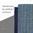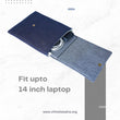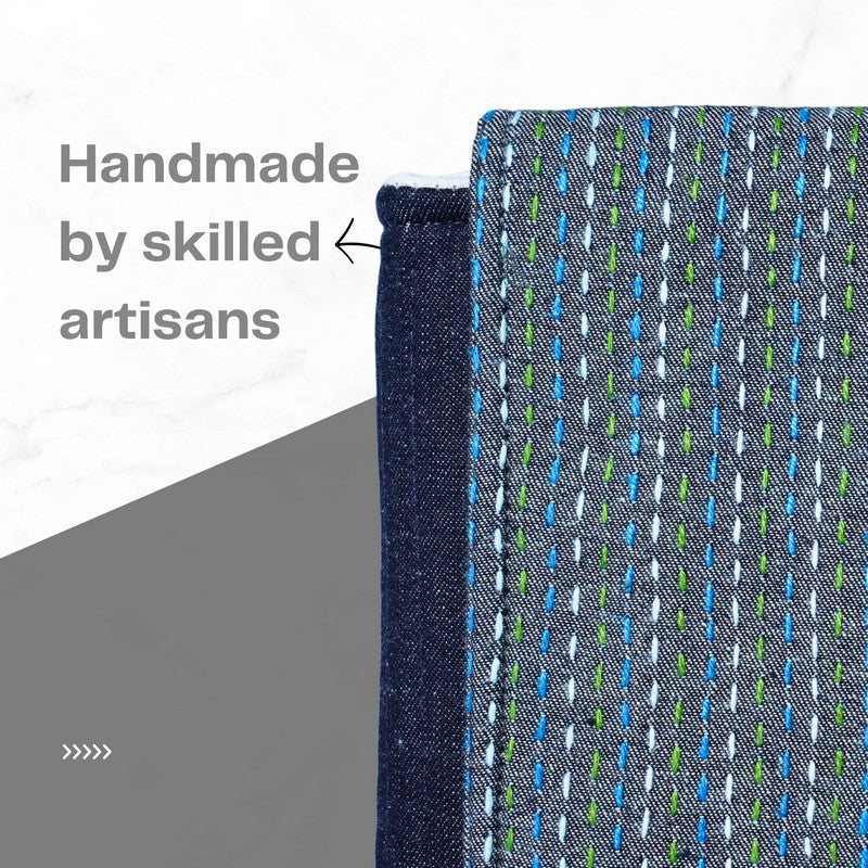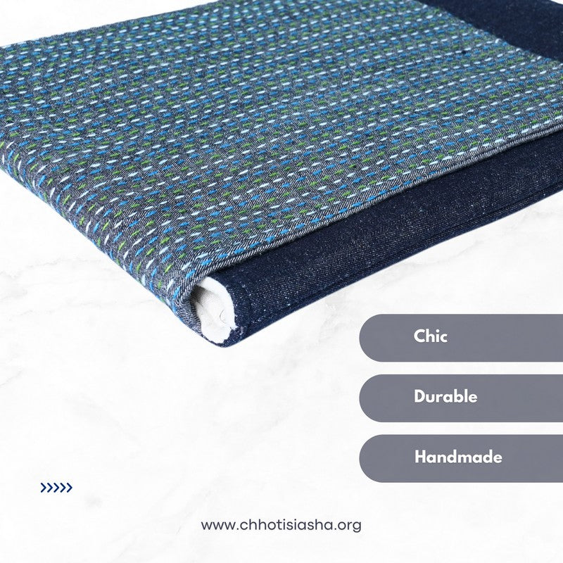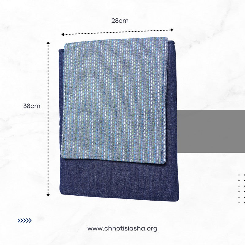 his vertical laptop sleeve brings calm confidence to your everyday carry. The base is sturdy quilted denim, while the flap features grey denim delicately hand-stitched with multicoloured Kantha lines. It’s subtle, sophisticated, and thoughtfully handcrafted for those who like their accessories understated but full of character.