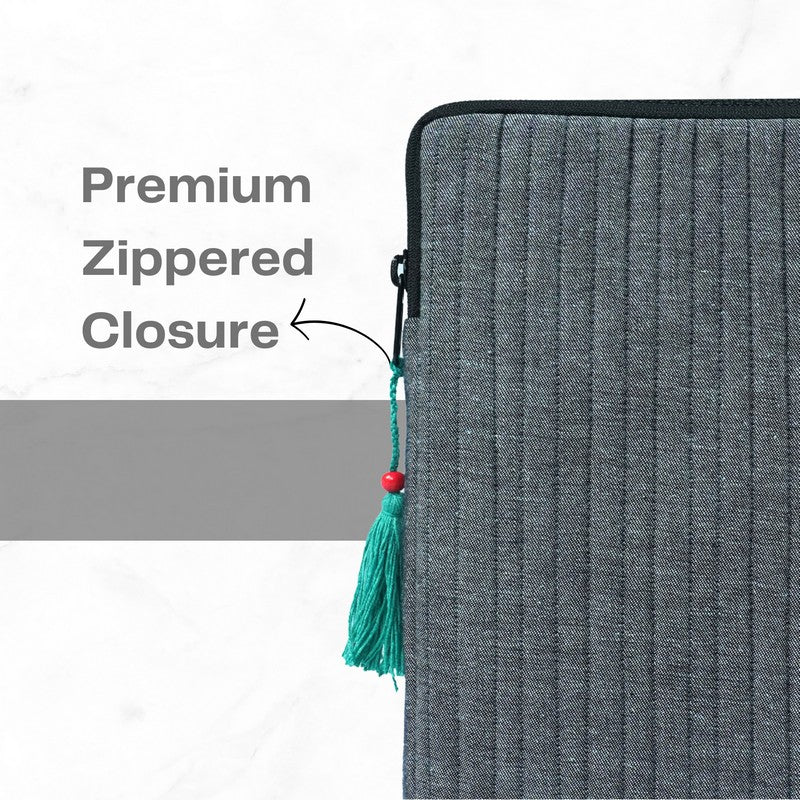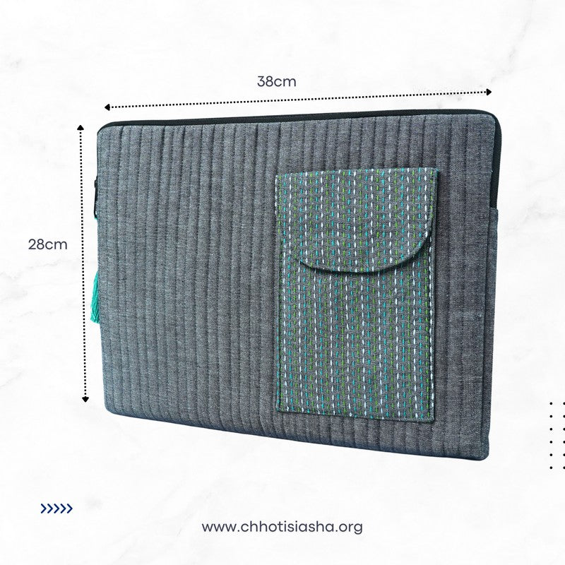 Made in rich quilted South cotton, this horizontal laptop sleeve blends everyday practicality with handcrafted charm. A thoughtfully placed front pocket adds a design twist—and a handy space for your charger, pen drive or notes. Finished with Kantha embroidery on the pocket flap, it’s a little detail that makes a big impression.