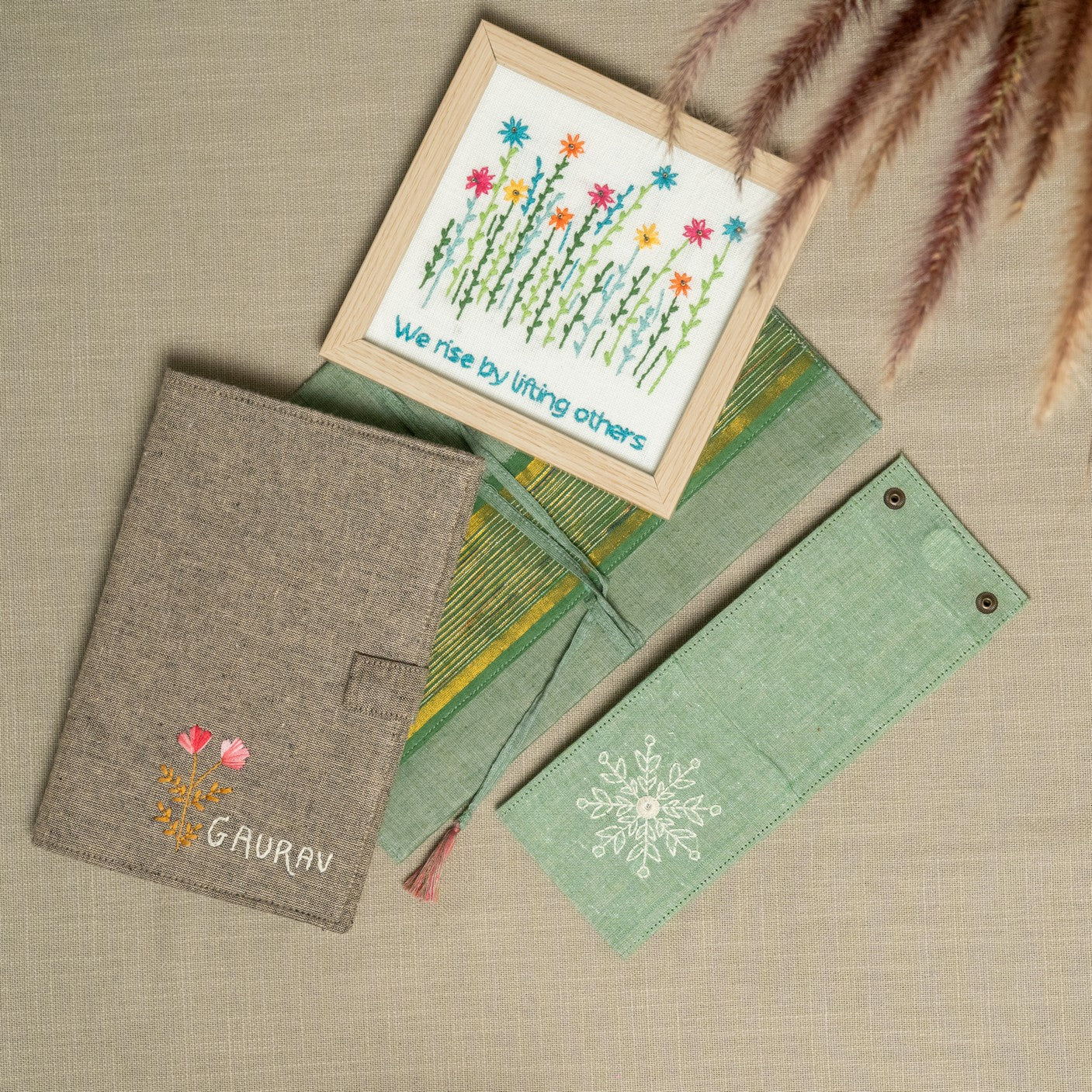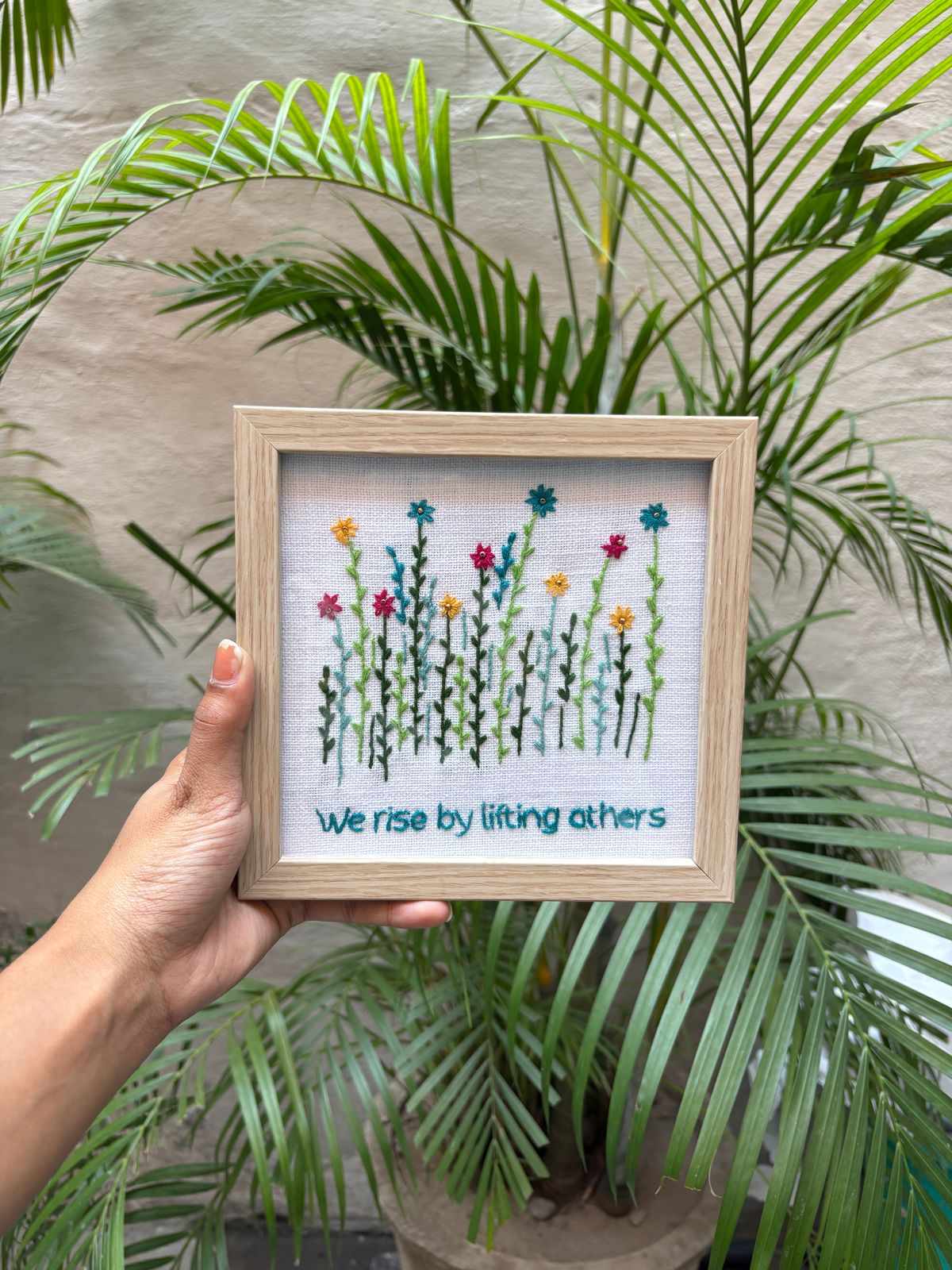 🖼️ 1 Hand-embroidered Frame (8 x 8 inches) – with blooming flowers and the words “We rise by lifting others” stitched with love, perfect to brighten a wall, desk, or shelf.