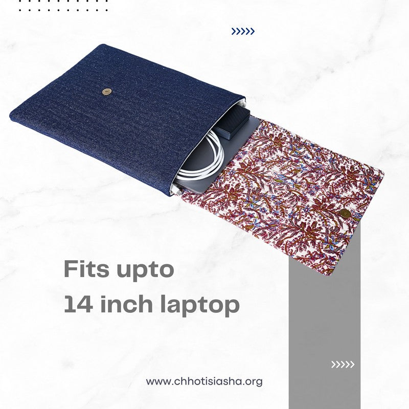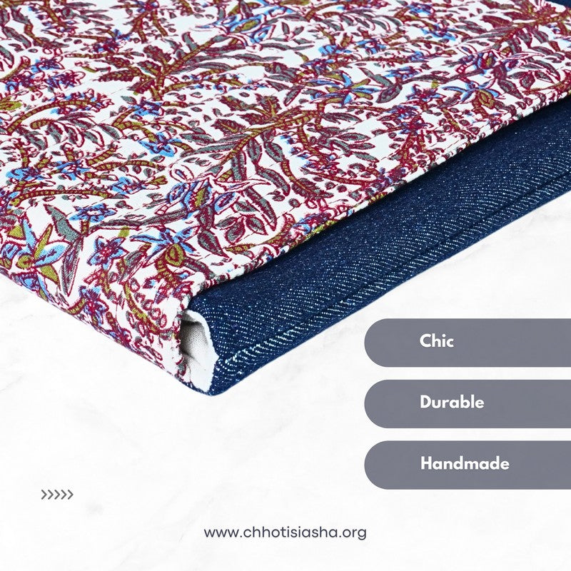 For those who love a touch of nature, this vertical sleeve brings together a sturdy blue denim base with a quilted flap in delicate pink-toned florals. Lightweight, functional, and charmingly handcrafted, it’s a gentle balance of design and durability.